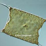 Kiezelwieren, ook wel diatomeeën genoemd, zijn ééncellige wieren en enkel microscopisch te bestuderen. Ze hebben een extern kiezelskelet (van siliciumdioxide) dat bestaat uit twee helften die als een doos en deksel in elkaar passen, met daar tussenin enkele zogenaamde gordelbanden. De twee helften worden de ‘schaaltjes’ genoemd (valvae). De schaaltjes hebben variabele vormen en ornamentaties en worden daarom gebruikt om soorten van elkaar te onderscheiden [14]. Kenmerkend voor deze soort is het rechthoekig uitzicht met aan elke hoek een uitsteeksel [19].