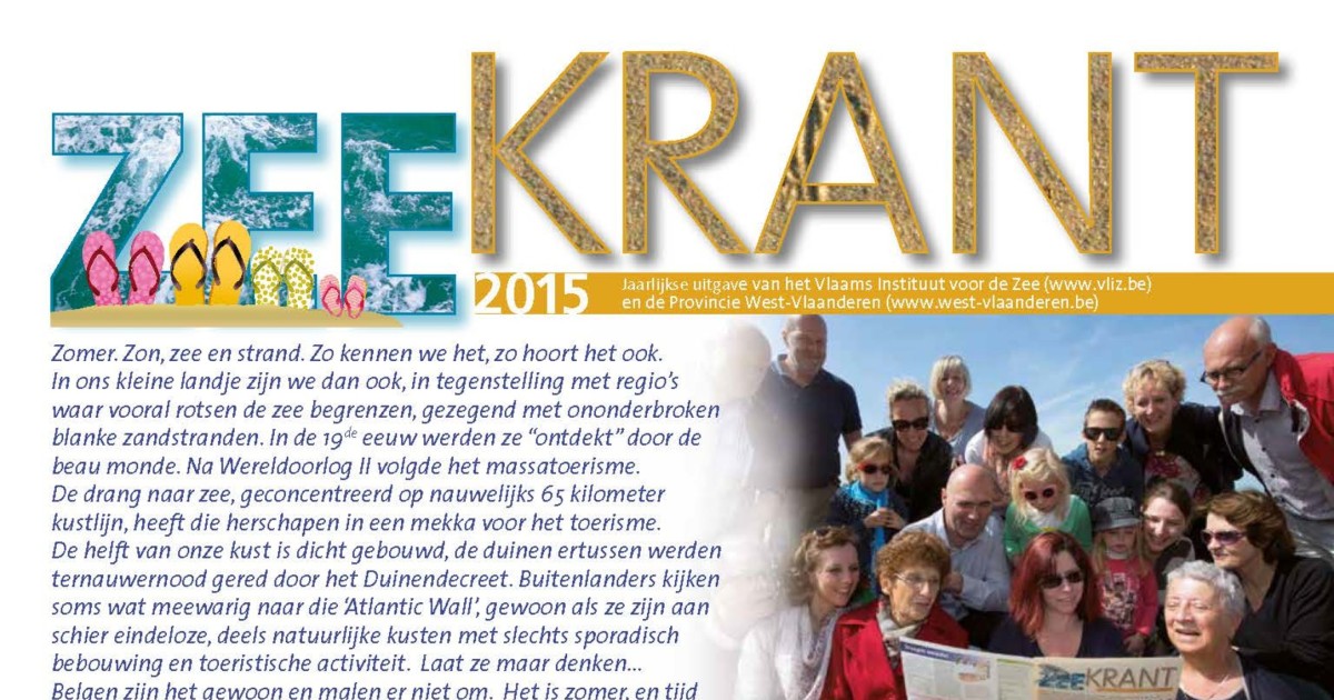 Seys, J. (Ed.) (2015). Zeekrant 2015: jaarlijkse uitgave van het Vlaams Instituut voor de Zee en de Provincie West-Vlaanderen. Zeekrant ... : jaarlijkse uitgave van het Vlaams Instituut voor de Zee en de Provincie West-Vlaanderen, 2015. Vlaams Instituut voor de Zee (VLIZ)/Provincie West-Vlaanderen: Oostende. 8 pp.