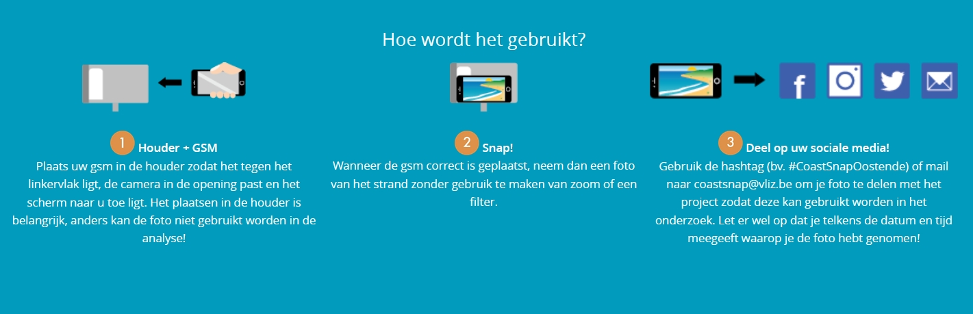 Het is makkelijk: plaats jouw gsm in de houder, neem de foto zonder zoom of filter, en deel ze op jouw sociale media account met vermelding van de op het infobord vermelde hashtag (vb. #CoastSnapOostende), datum & tijd. Je kan de foto ook mailen naar coastsnap@vliz.be en vermeld ook hier locatie, datum & tijd.