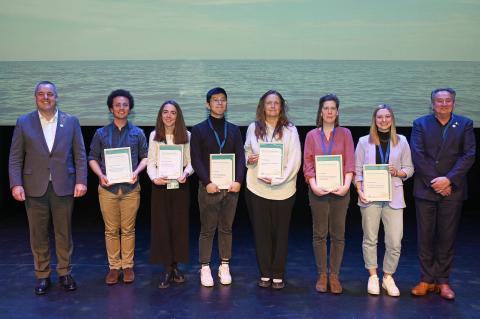 De BMRI-laureaten 2024, v.l.n.r.: Estelle Bertimes (VLIZ), Shamil Debaere (UAntwerpen), Astrid Hylén (UAntwerpen), Luz Amadei Martínez (UGent), Qiming Sun (UGent), Broos Van de Moortel (KU Leuven)