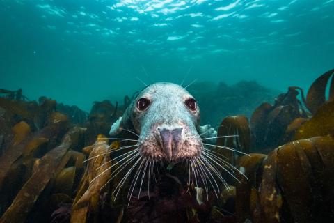 Een wel erg nieuwsgierige grijze zeehond, opduikend uit een kelpwoud.