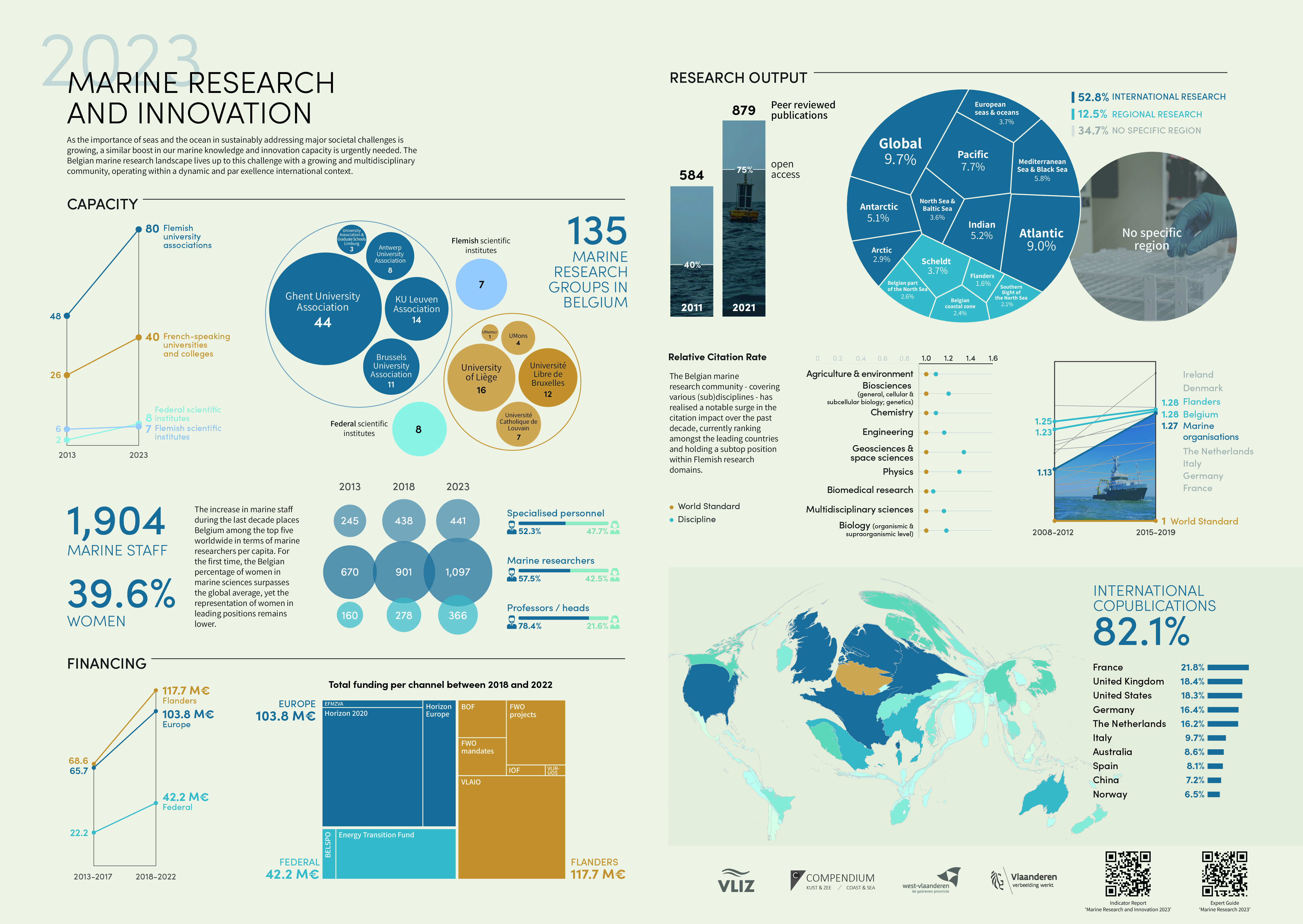 The marine research capacity in our country is quite large: 135 marine research groups employ over 1,900 marine researchers and specialised personnel in 23 research disciplines. 600 to 900 Belgian marine peer-reviewed publications appear annually. Most research is conducted outside the borders of the North Sea and in collaboration with foreign researchers.