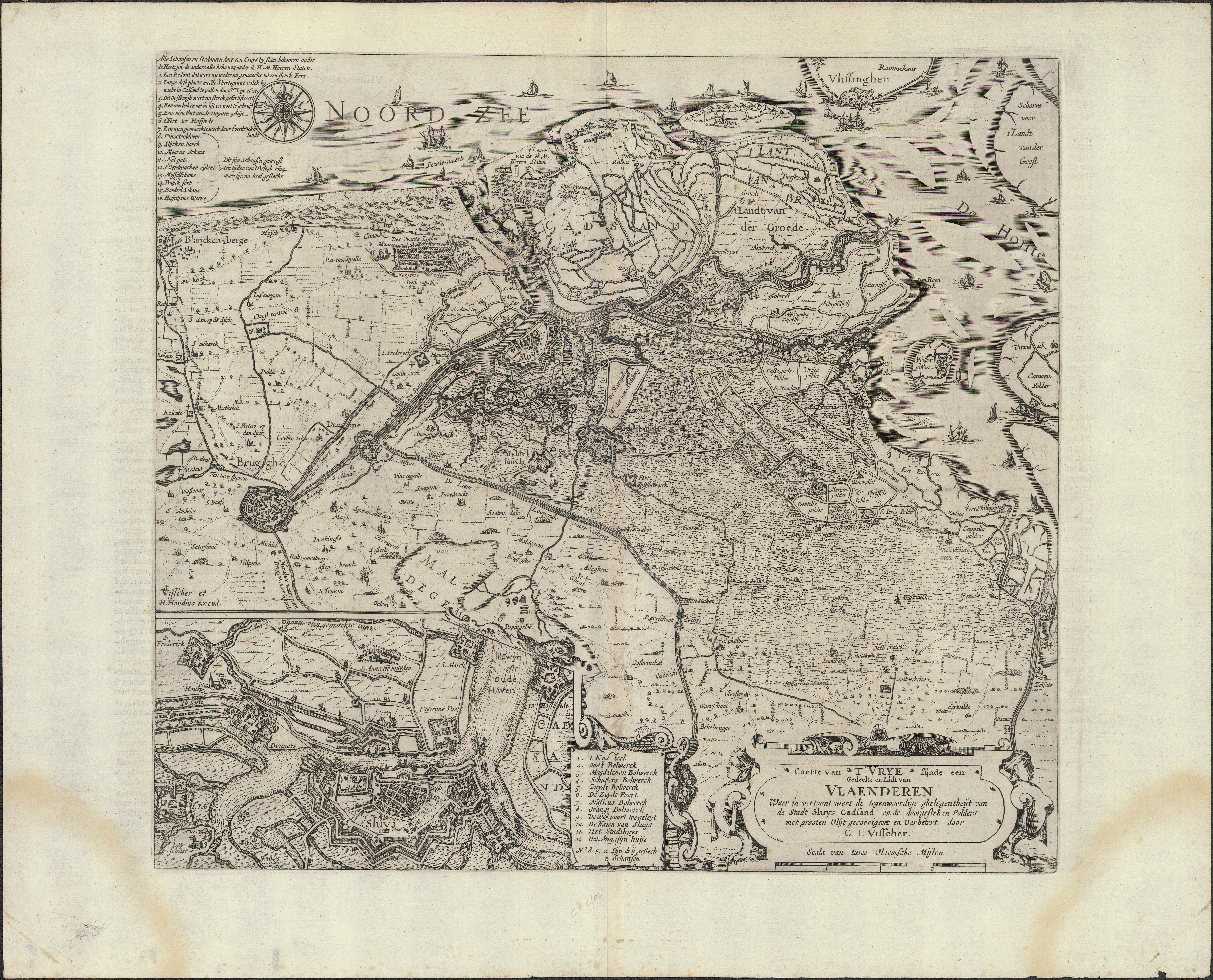 Caerte van t'Vrye sijnde een gedeelte en lidt van Vlaenderen waer in vertoont wert de tegenwoordige ghelegentheijt van de stadt Sluys Cadsand en de doorgesteken polders met grooten vlijt gecorrigeert en verbetert (1622)