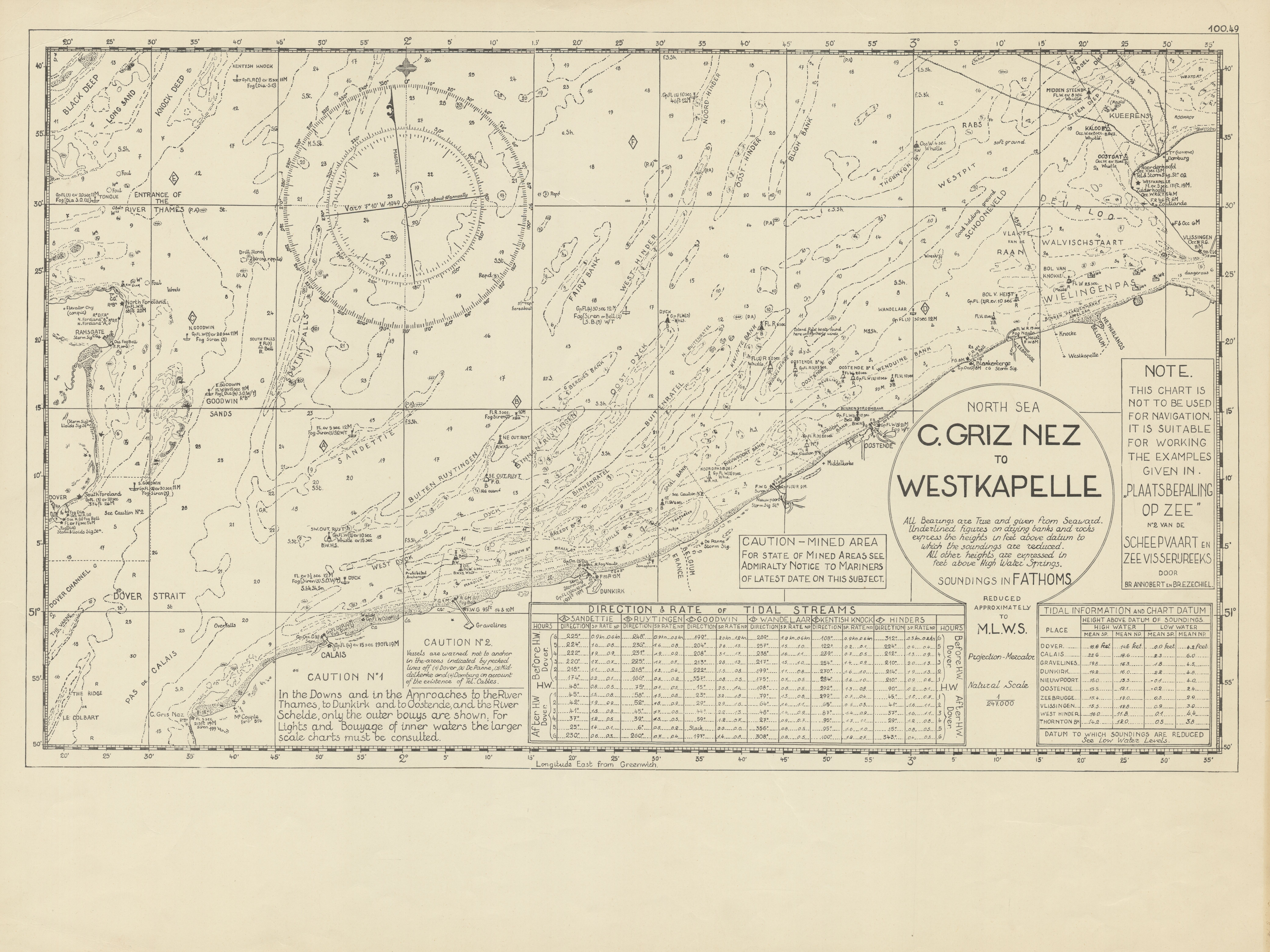 North Sea - C. Griz Nez to Westkapelle. Kaart om zeeligging te bepalen in de Noordzee, behorend bij het schoolboek Plaatsbepaling op Zee, in Scheepvaart- en Zeevisserijreeks nr. 2 (Menen, 1949).