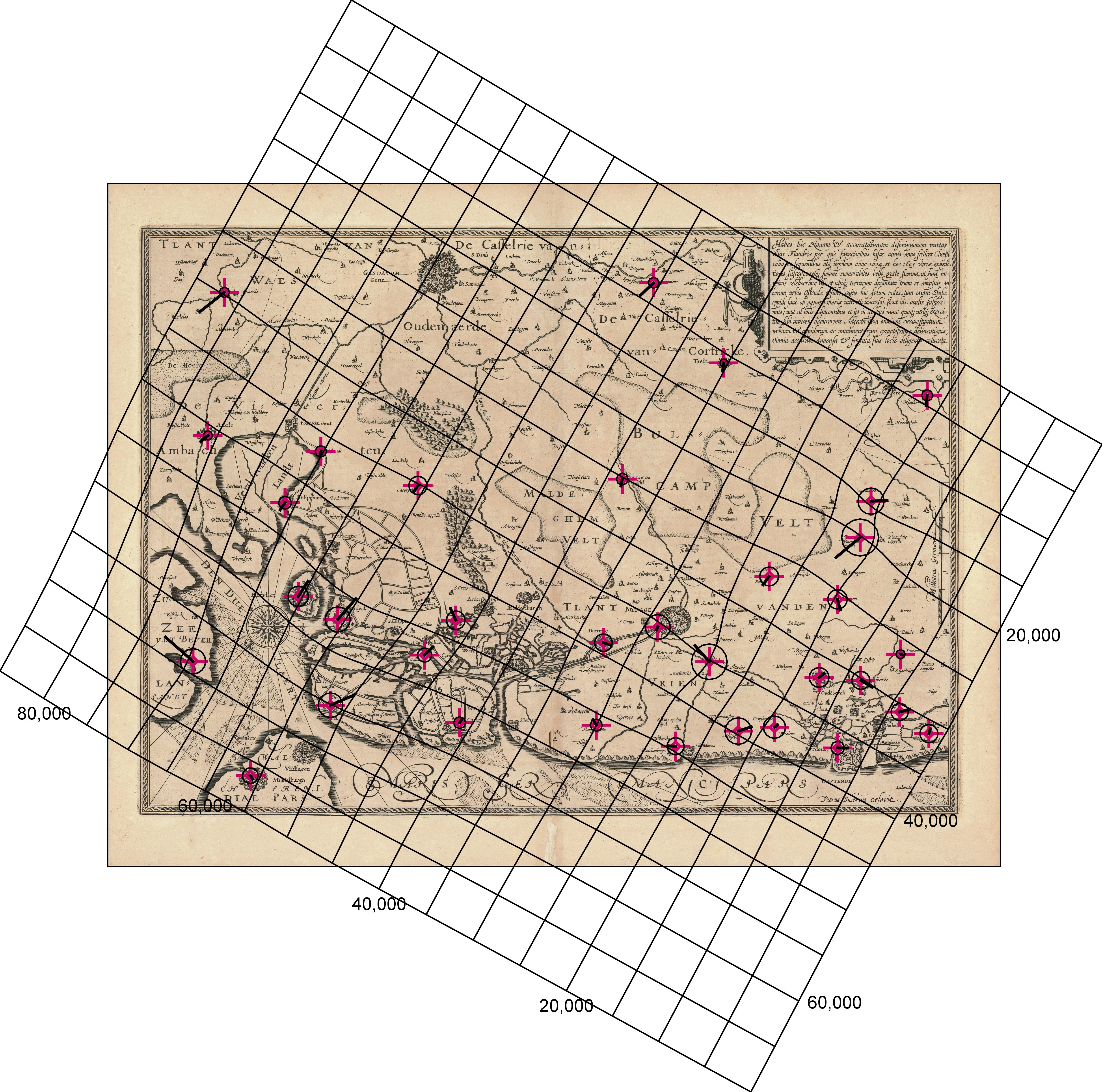Het vervormingsgrid en de verplaatsingsvectoren geven een beeld van de geometrische nauwekeurigheid van de kaart en werden gegenereerd in MapAnalyst (