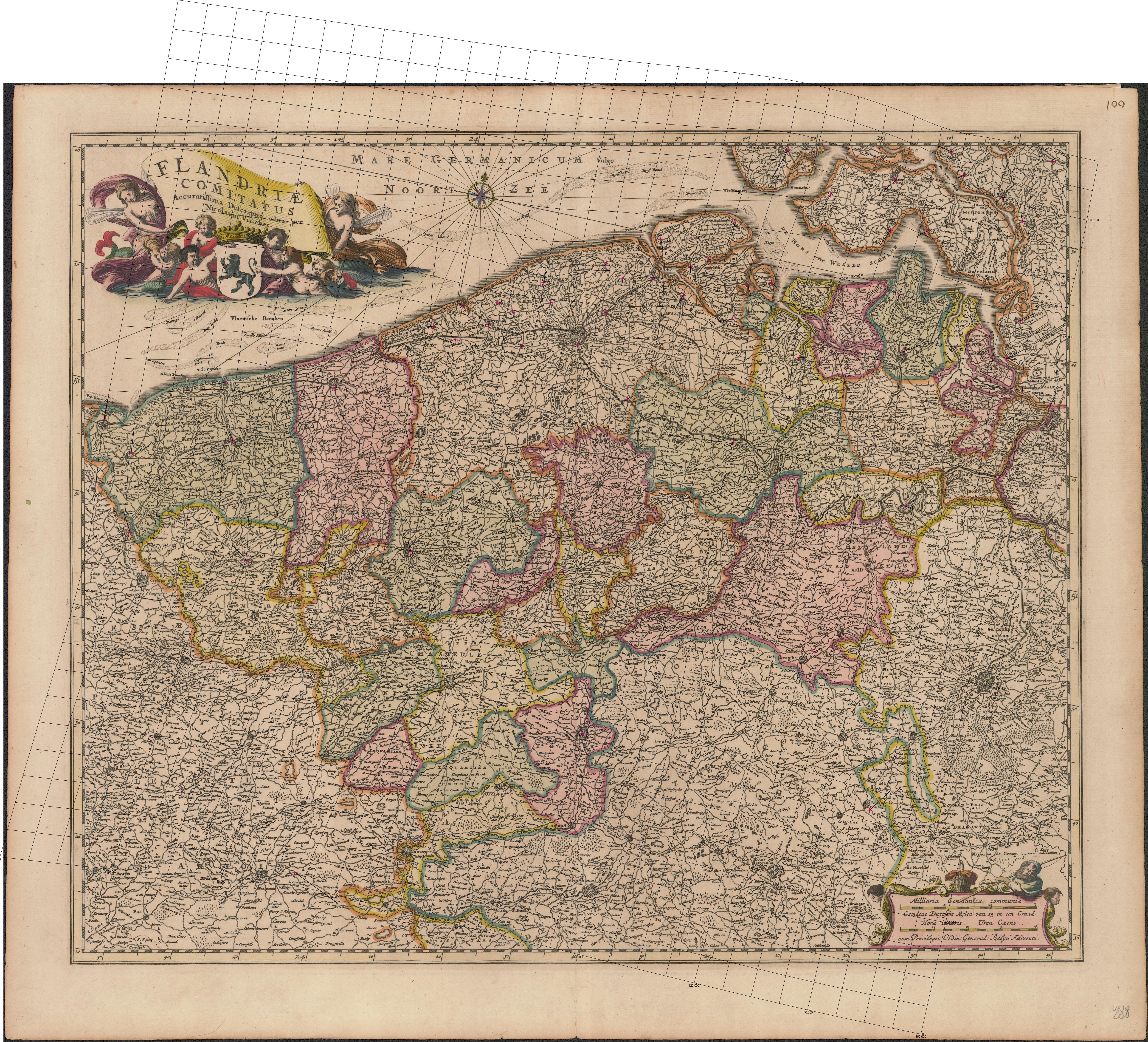 Het vervormingsgrid en de verplaatsingsvectoren geven een beeld van de geometrische nauwekeurigheid van de kaart en werden gegenereerd in MapAnalyst (