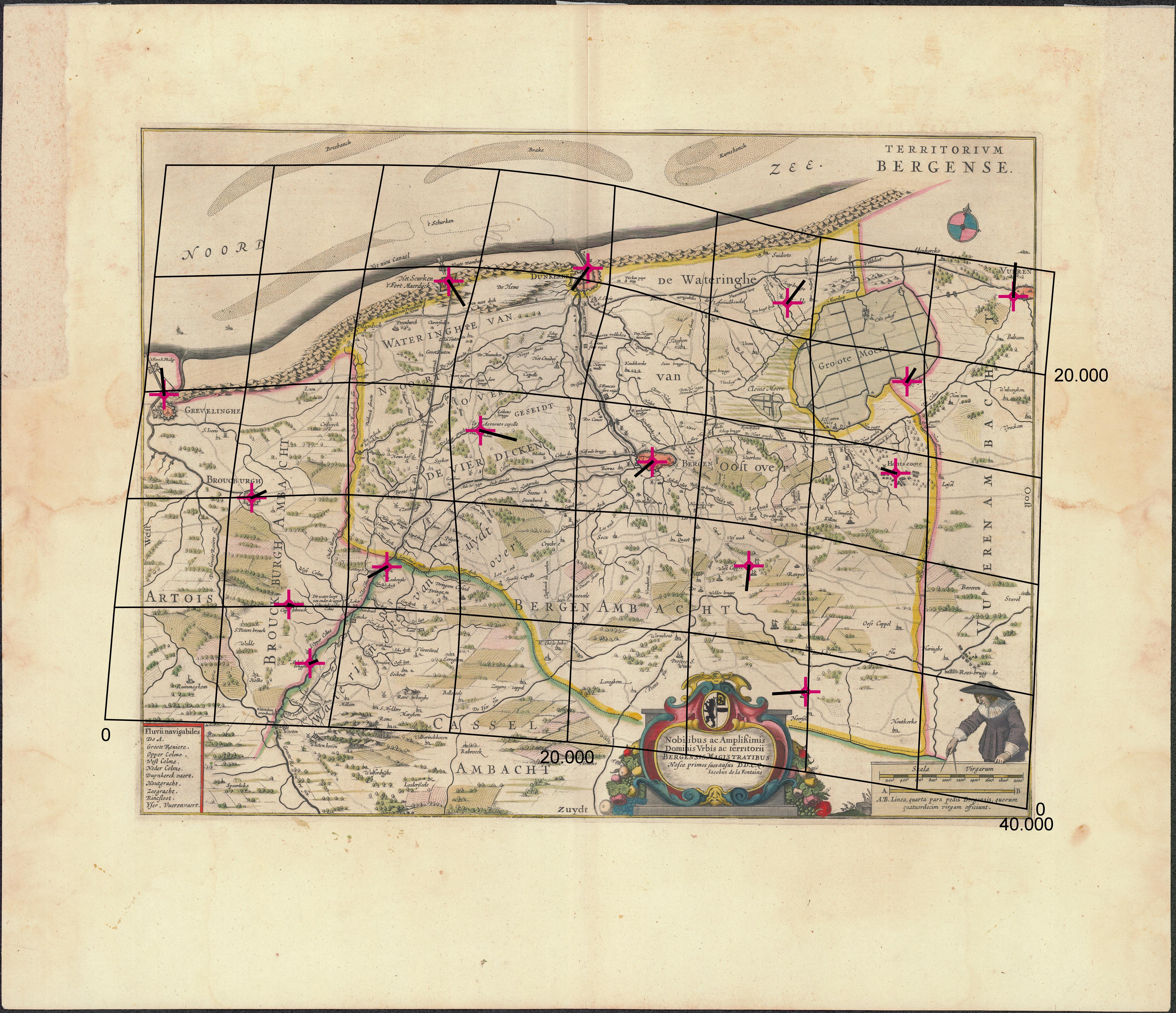 Het vervormingsgrid en de verplaatsingsvectoren geven een beeld van de geometrische nauwekeurigheid van de kaart en werden gegenereerd in MapAnalyst (