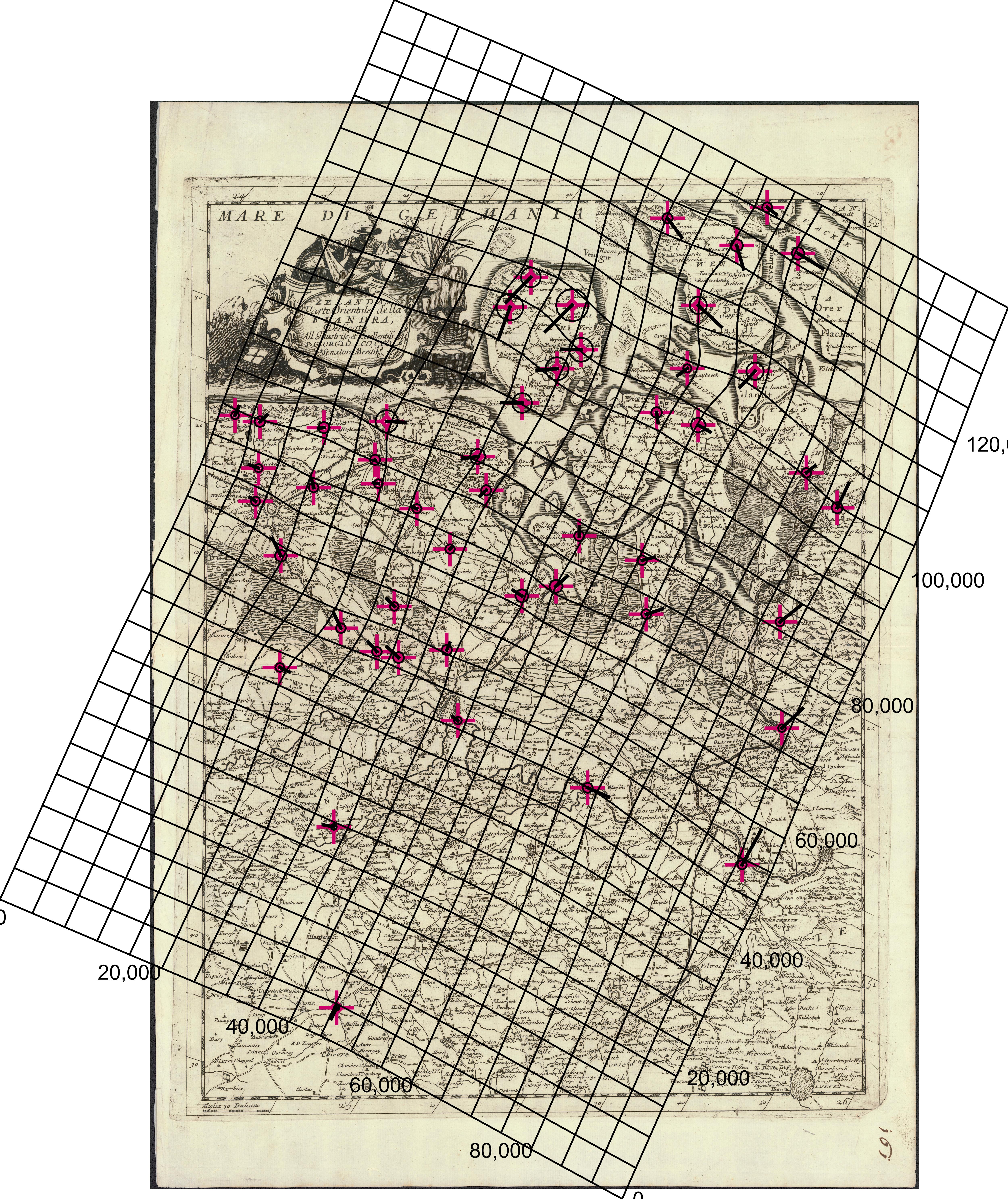 Het vervormingsgrid en de verplaatsingsvectoren geven een beeld van de geometrische nauwekeurigheid van de kaart en werden gegenereerd in MapAnalyst (