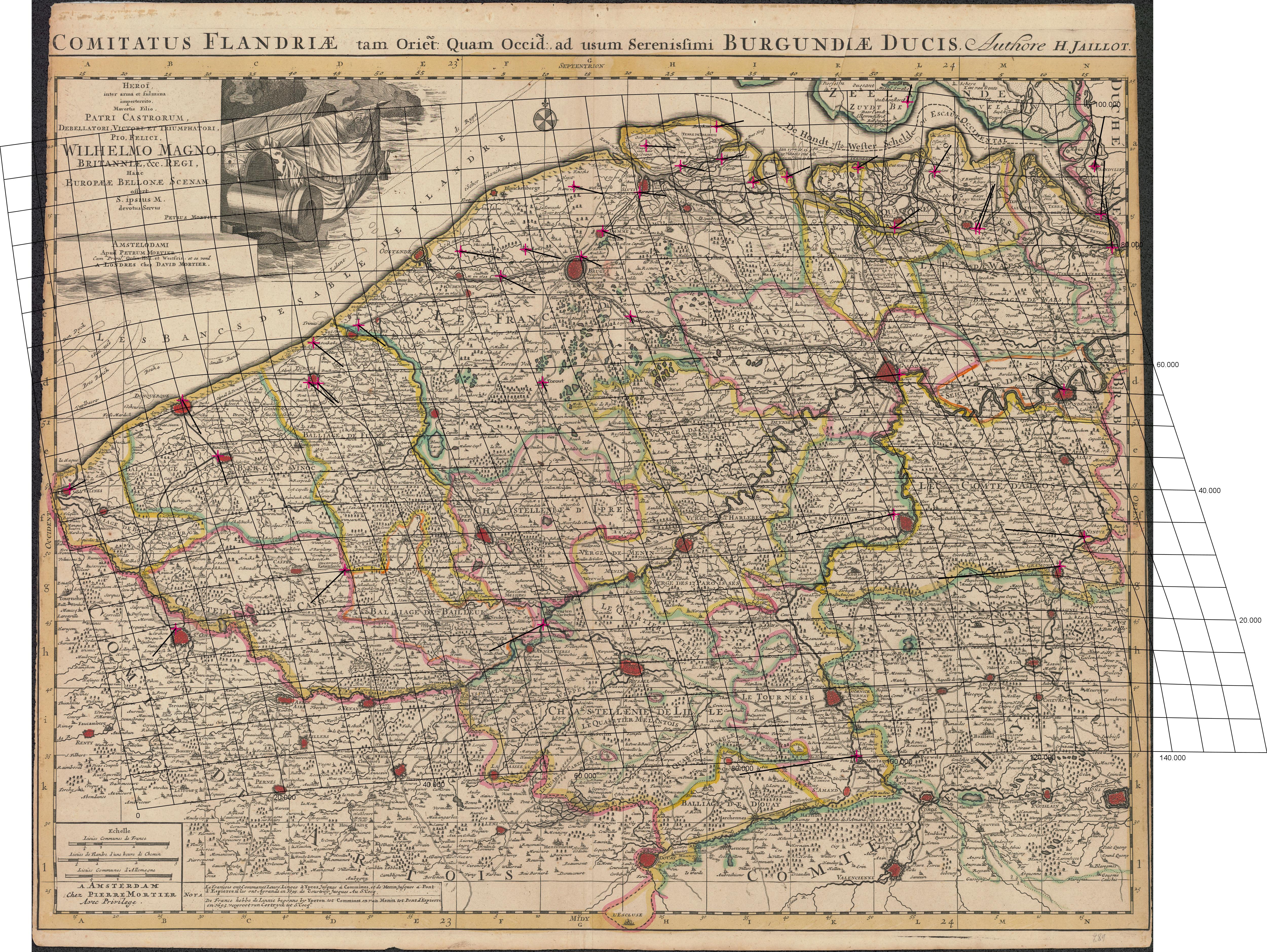 Het vervormingsgrid en de verplaatsingsvectoren geven een beeld van de geometrische nauwekeurigheid van de kaart en werden gegenereerd in MapAnalyst (