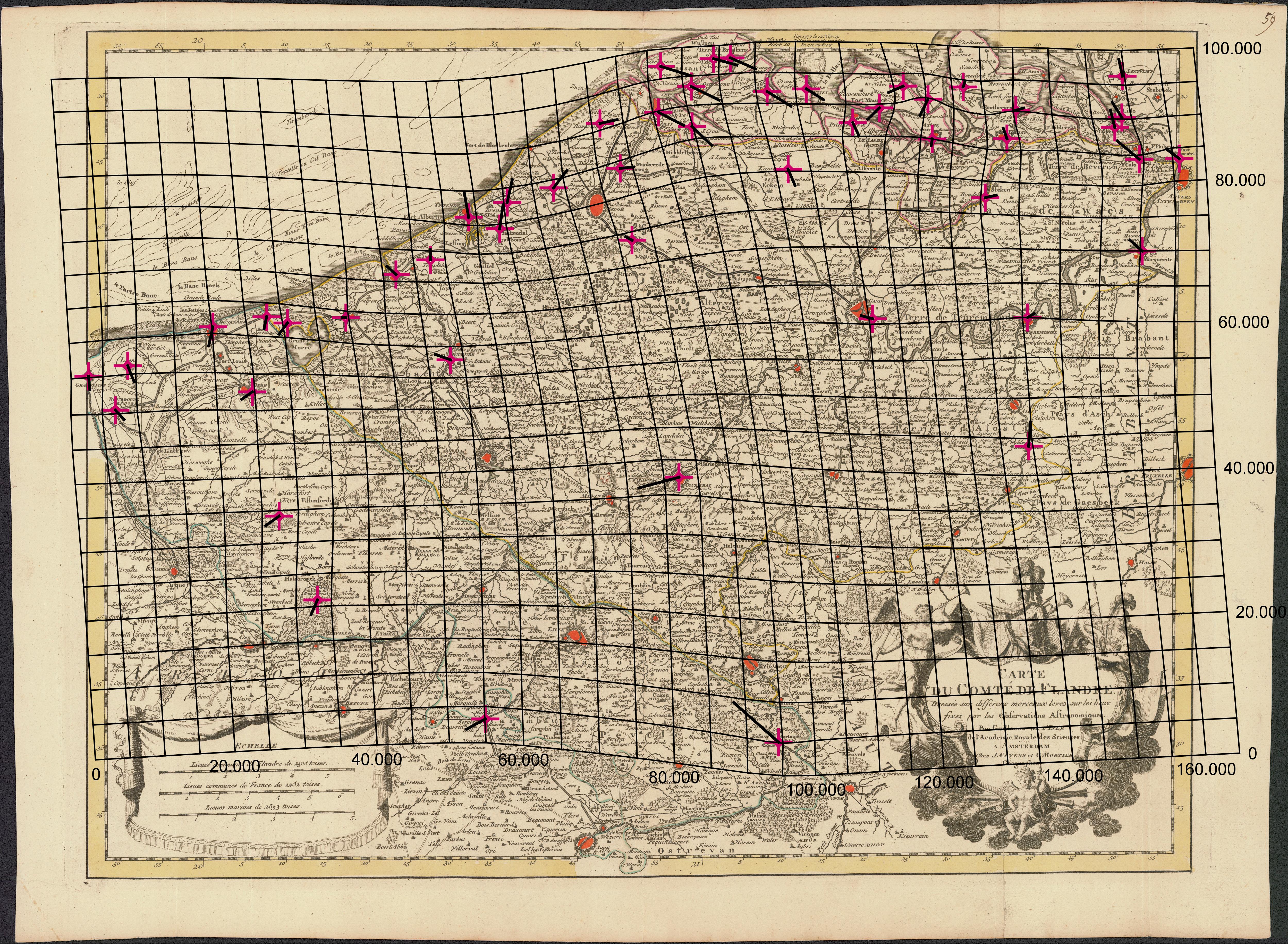 Het vervormingsgrid en de verplaatsingsvectoren geven een beeld van de geometrische nauwekeurigheid van de kaart en werden gegenereerd in MapAnalyst (