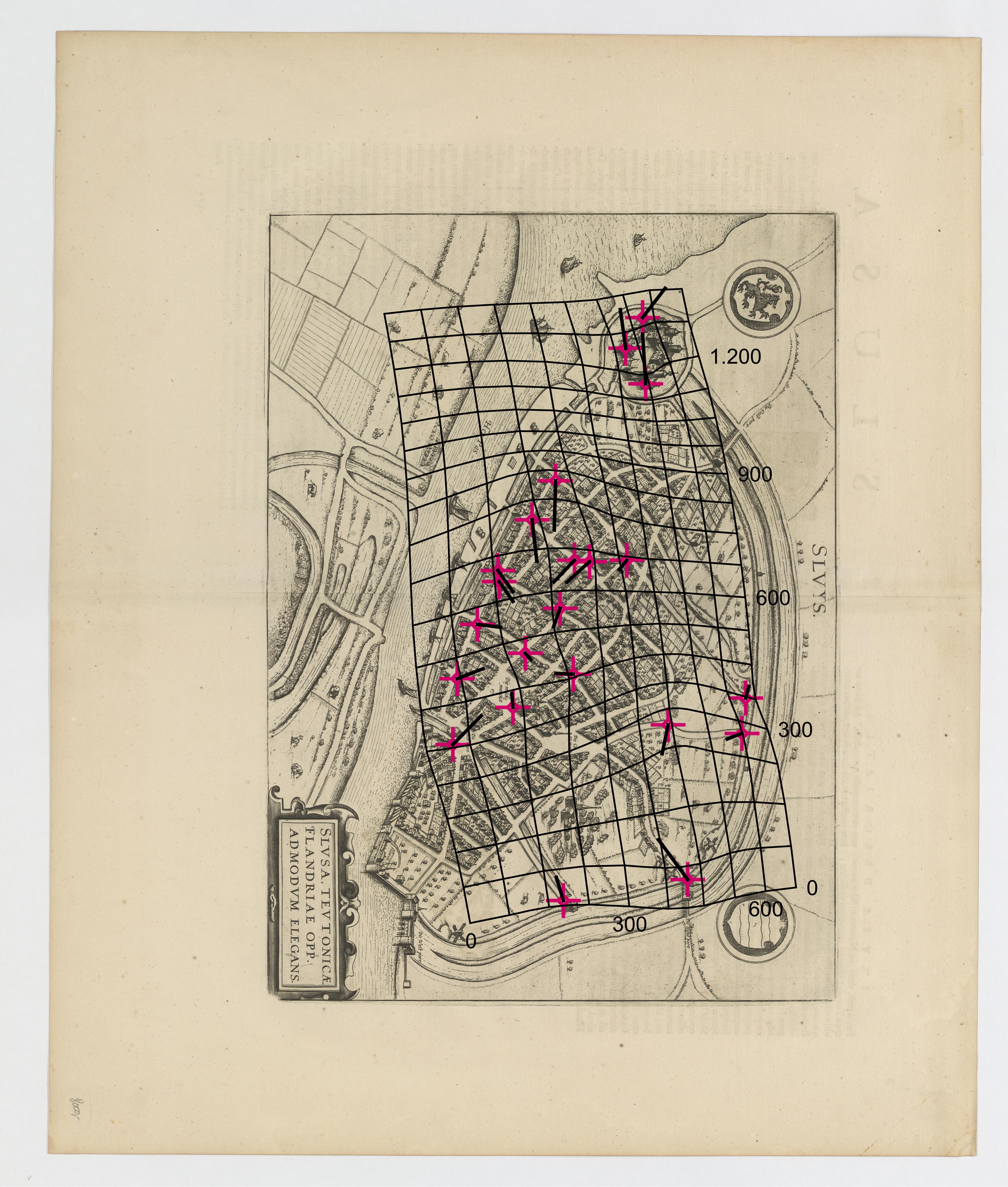 Het vervormingsgrid en de verplaatsingsvectoren geven een beeld van de geometrische nauwekeurigheid van de kaart en werden gegenereerd in MapAnalyst (