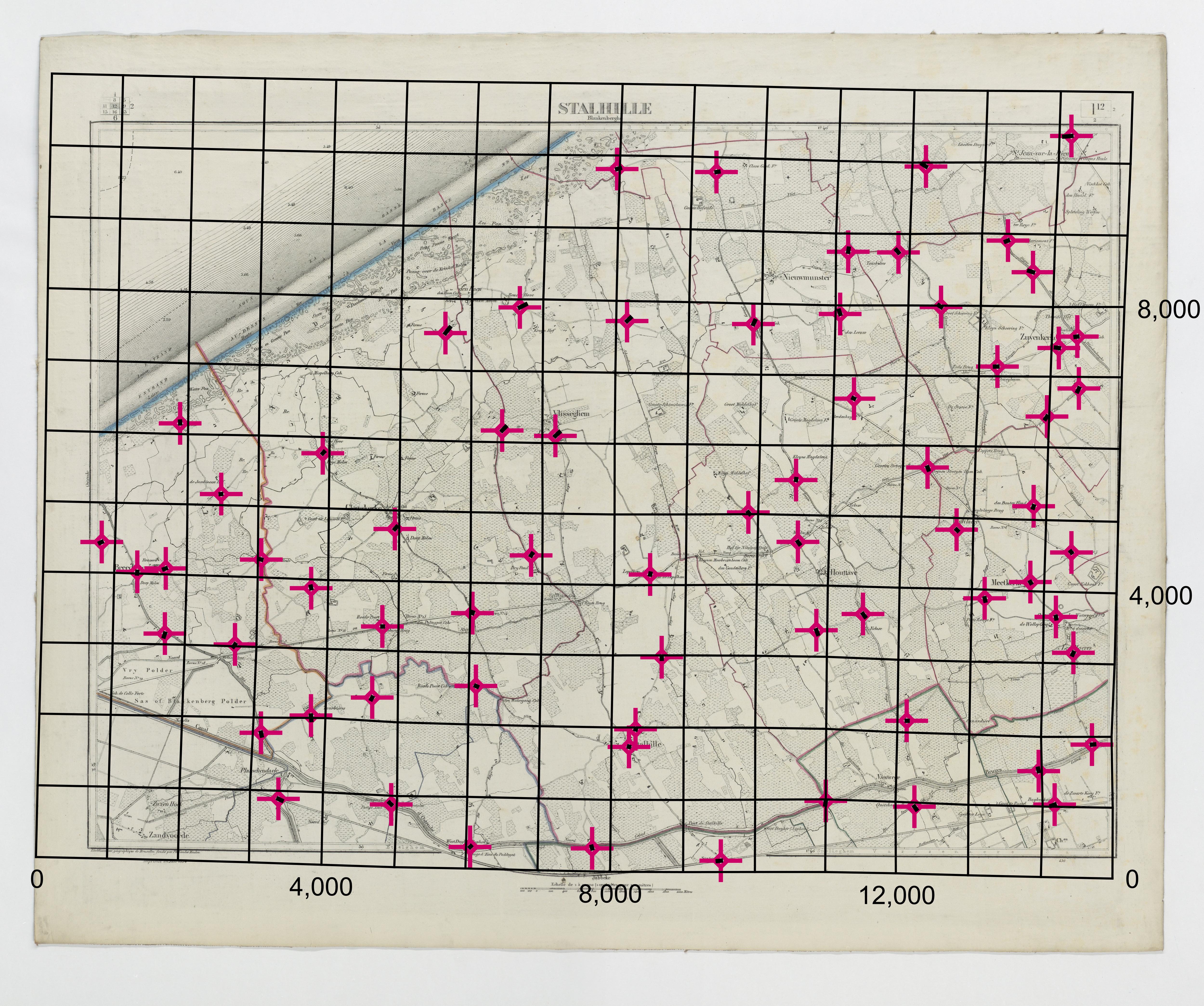 Het vervormingsgrid en de verplaatsingsvectoren geven een beeld van de geometrische nauwekeurigheid van de kaart en werden gegenereerd in MapAnalyst (