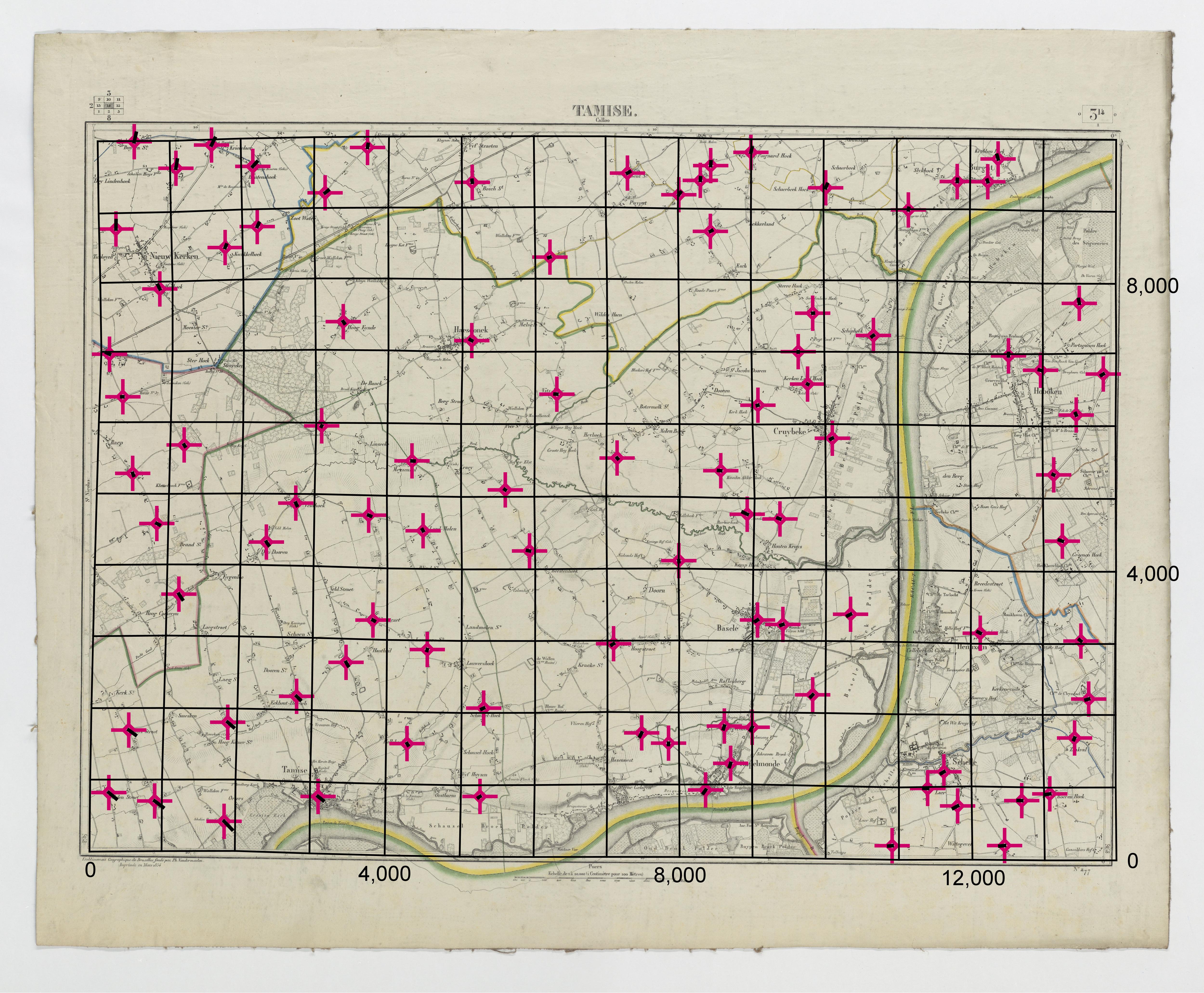 Het vervormingsgrid en de verplaatsingsvectoren geven een beeld van de geometrische nauwekeurigheid van de kaart en werden gegenereerd in MapAnalyst (