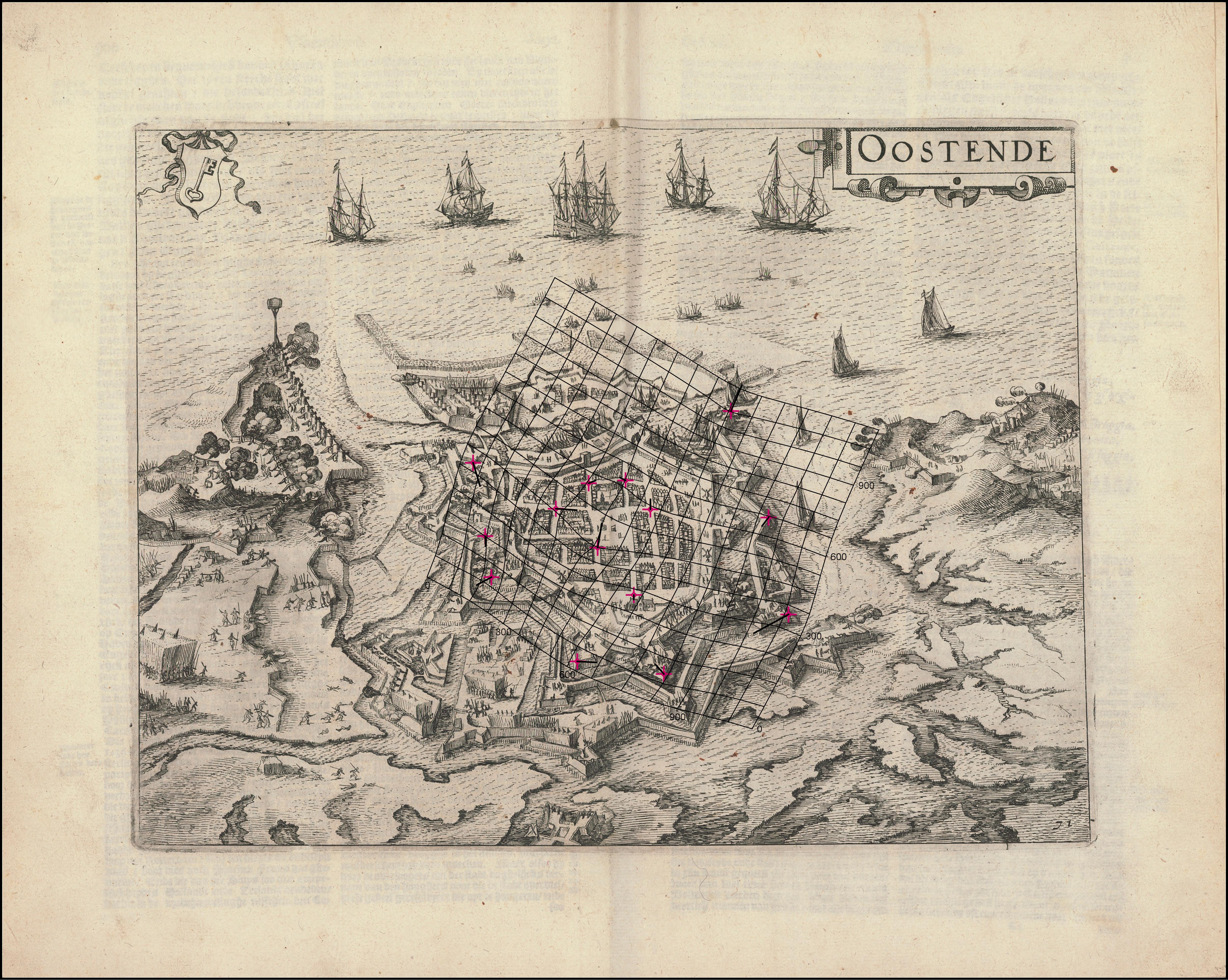Het vervormingsgrid en de verplaatsingsvectoren geven een beeld van de geometrische nauwekeurigheid van de kaart en werden gegenereerd in MapAnalyst (