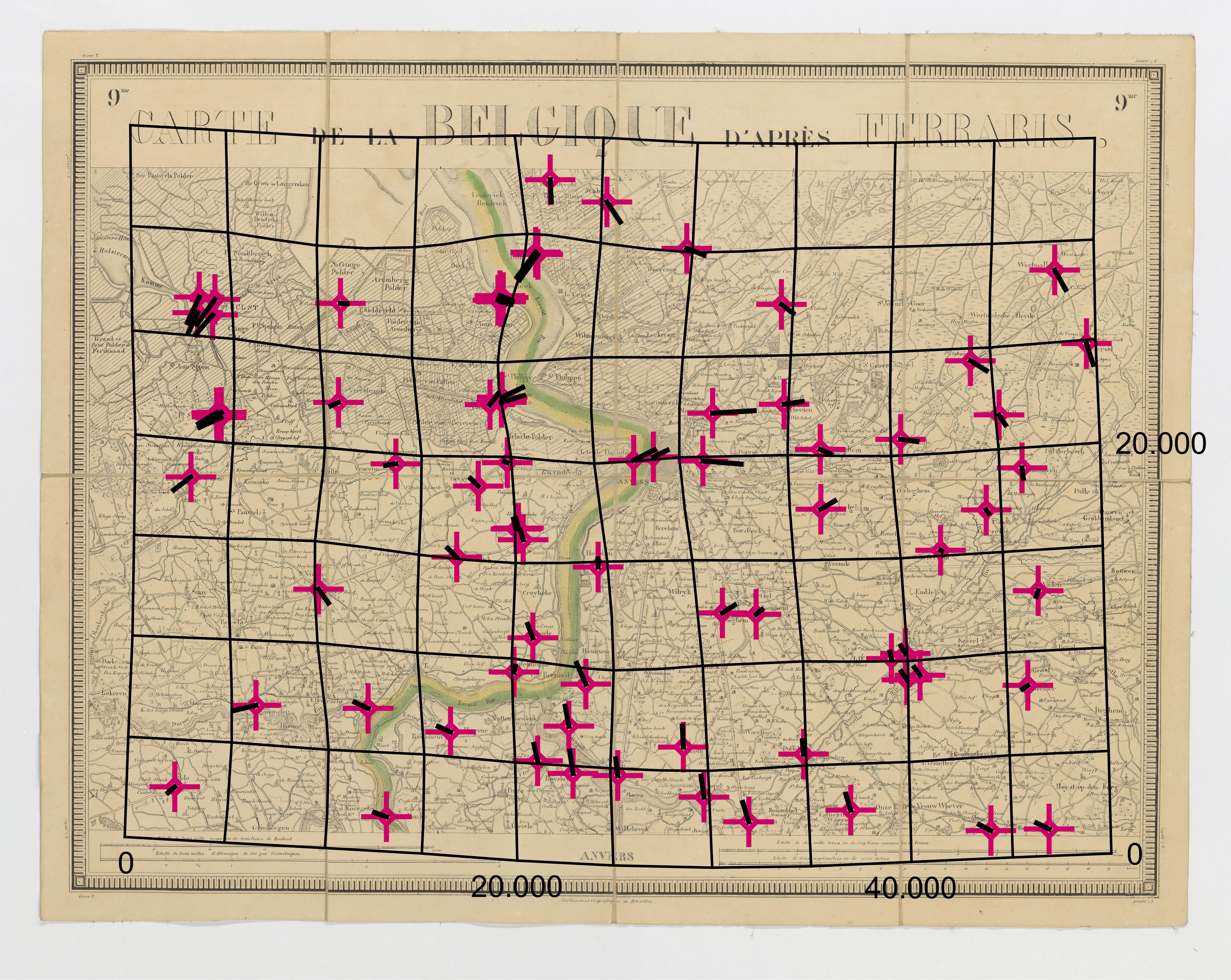 Carte de la Belgique d'après Ferraris, augmentée des plans des six villes principales et de l'indication des routes, canaux et autres traveaux exécutés depuis 1777 jusqu'en 1831. 42 feuilles. II