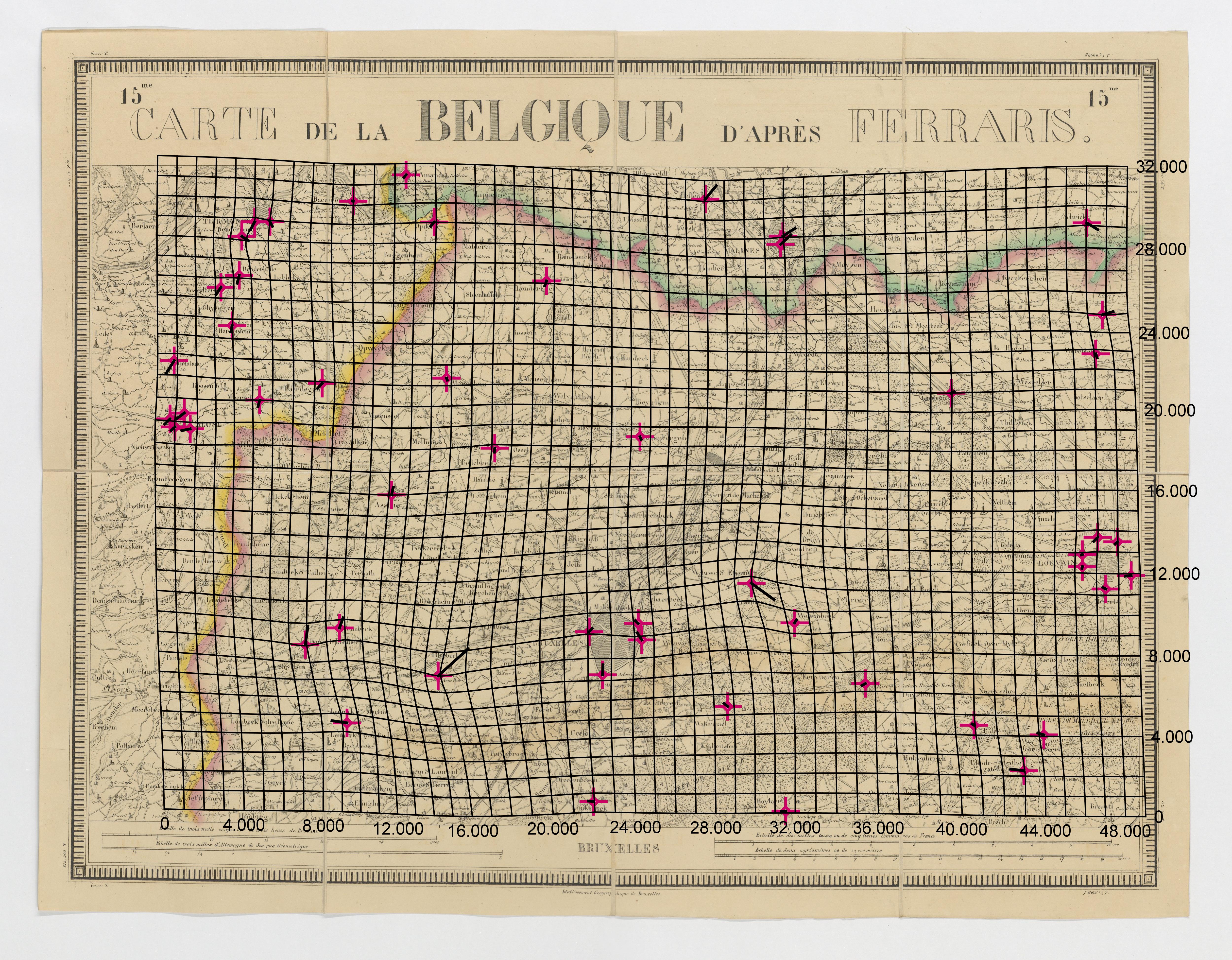 Het vervormingsgrid en de verplaatsingsvectoren geven een beeld van de geometrische nauwekeurigheid van de kaart en werden gegenereerd in MapAnalyst (