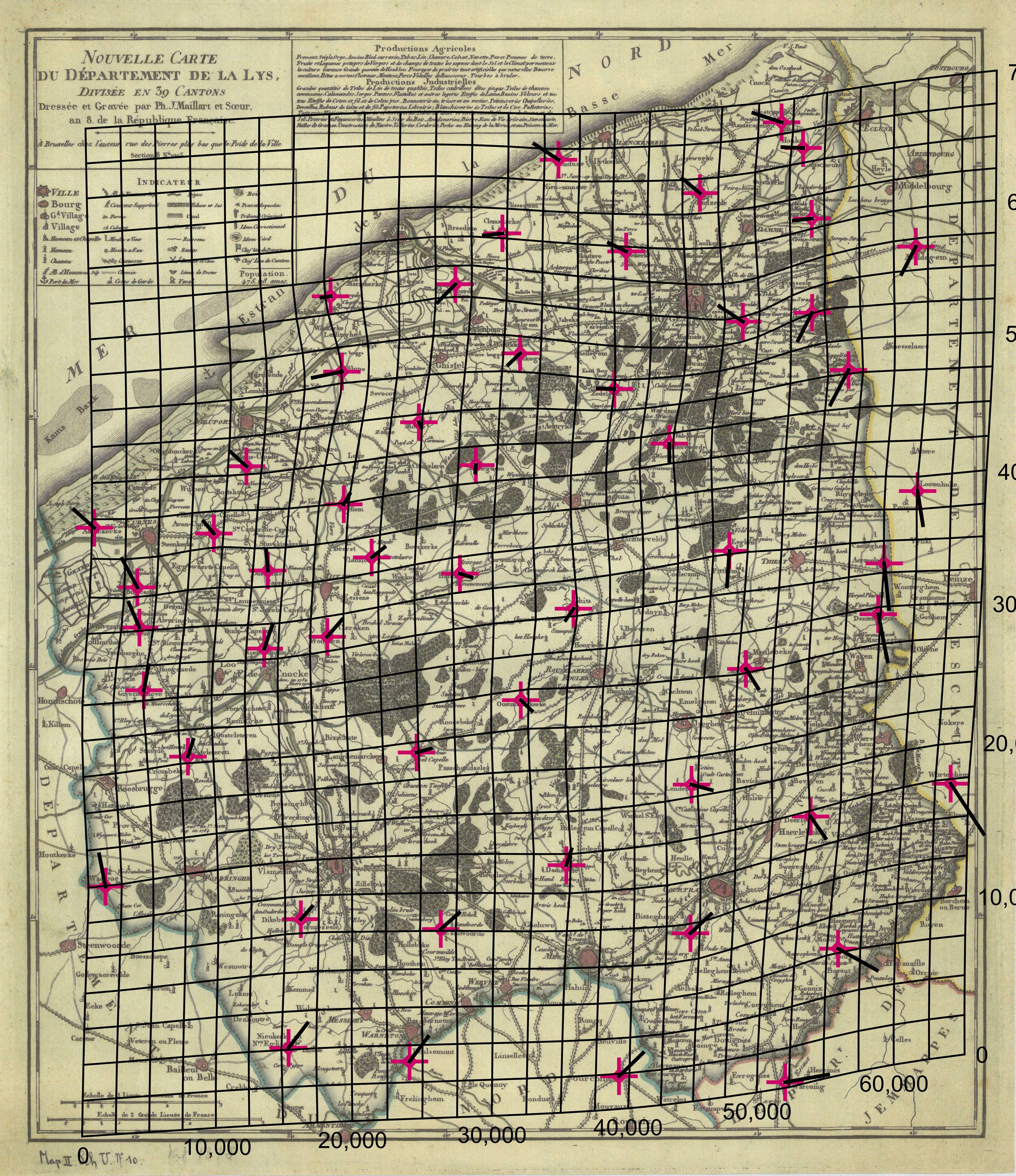 Het vervormingsgrid en de verplaatsingsvectoren geven een beeld van de geometrische nauwekeurigheid van de kaart en werden gegenereerd in MapAnalyst (
