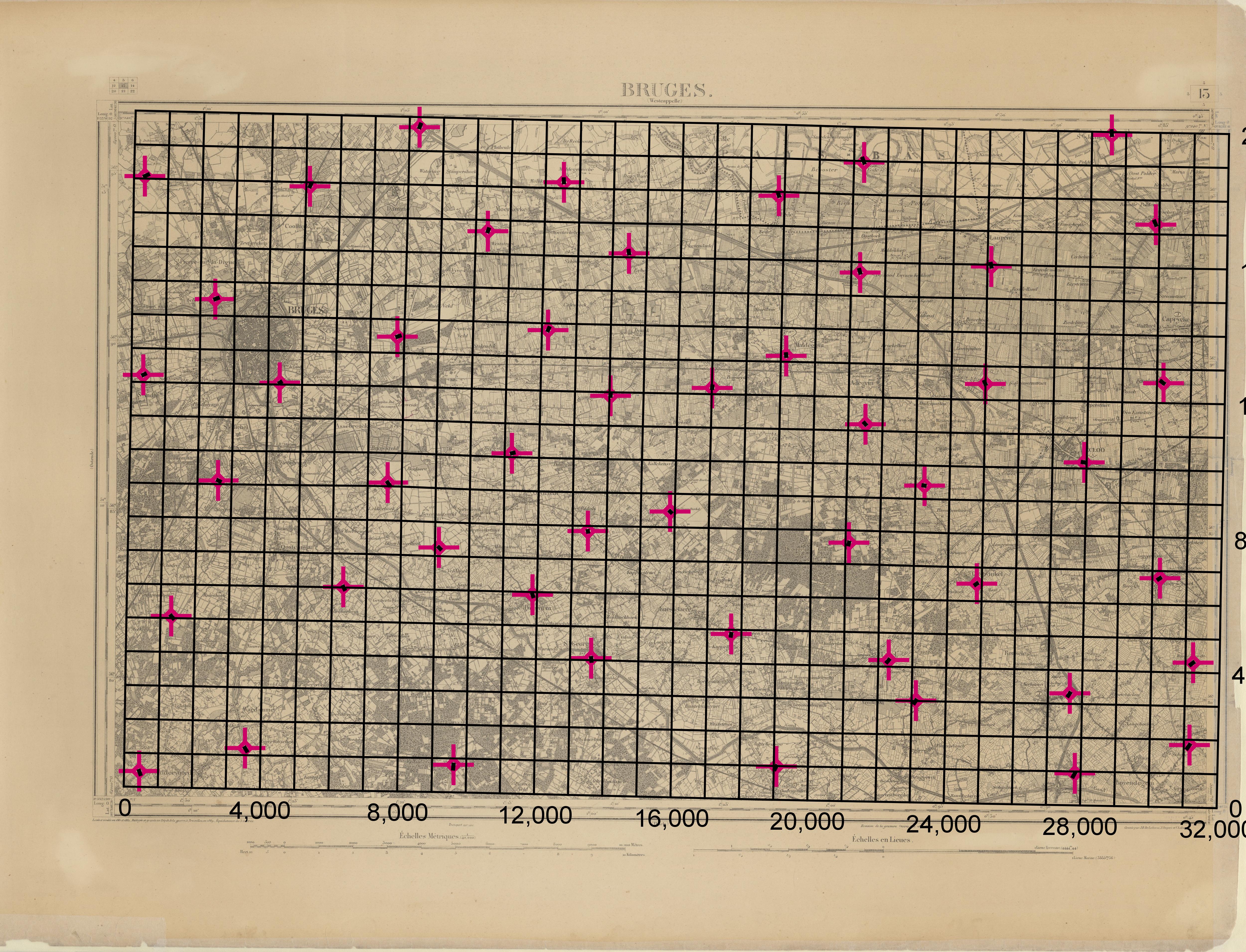 Het vervormingsgrid en de verplaatsingsvectoren geven een beeld van de geometrische nauwekeurigheid van de kaart en werden gegenereerd in MapAnalyst (