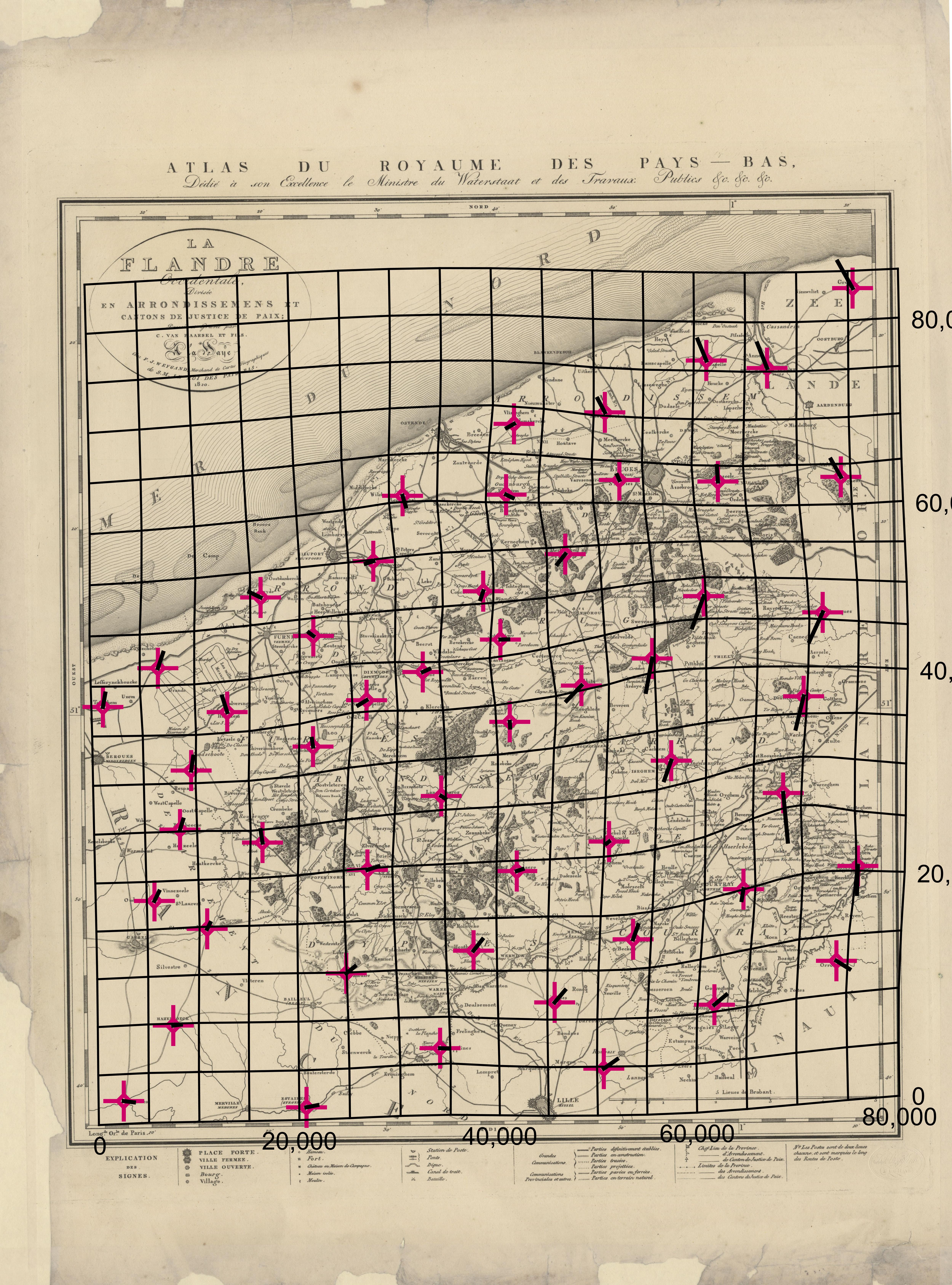 Het vervormingsgrid en de verplaatsingsvectoren geven een beeld van de geometrische nauwekeurigheid van de kaart en werden gegenereerd in MapAnalyst (