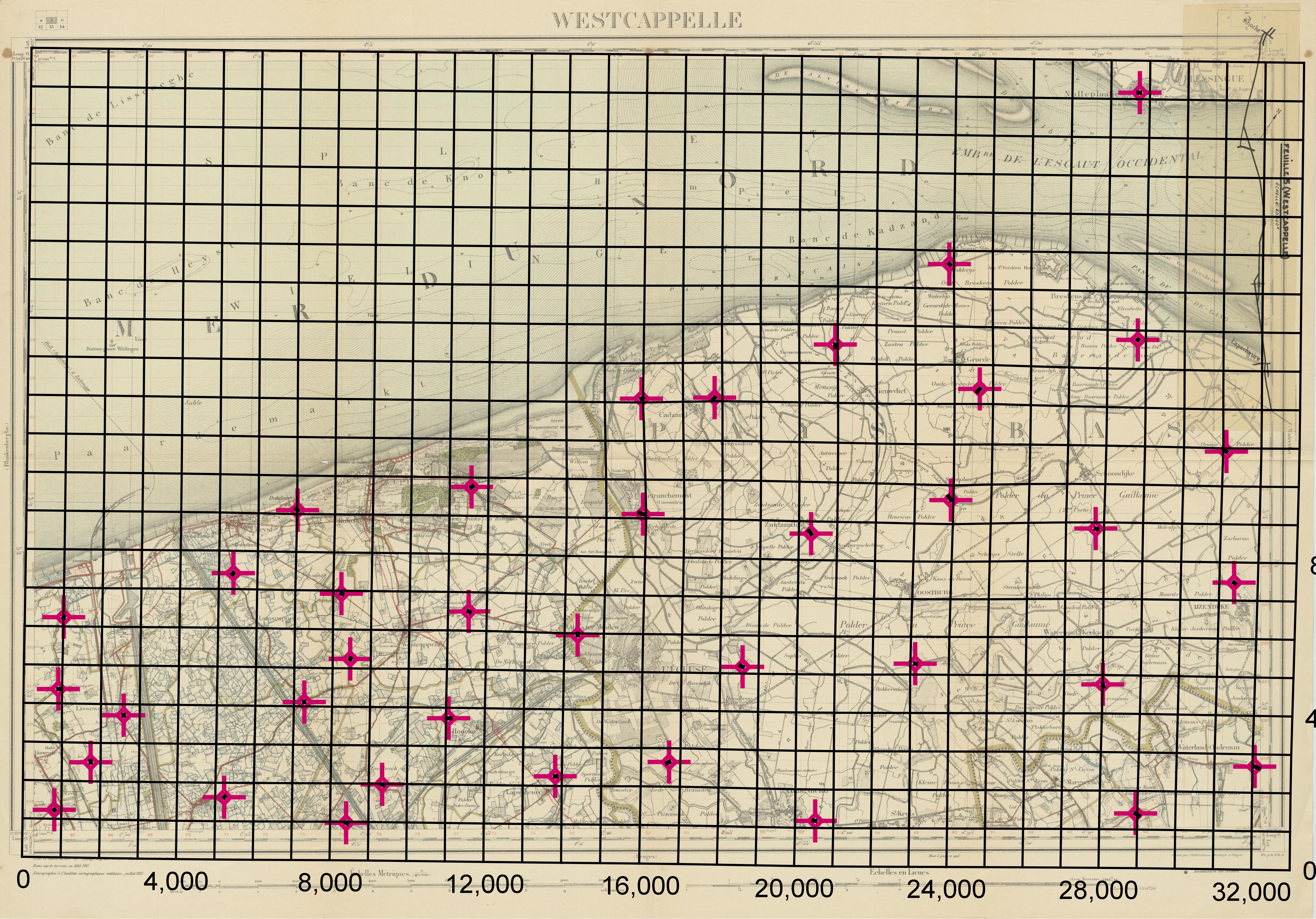 Het vervormingsgrid en de verplaatsingsvectoren geven een beeld van de geometrische nauwekeurigheid van de kaart en werden gegenereerd in MapAnalyst (