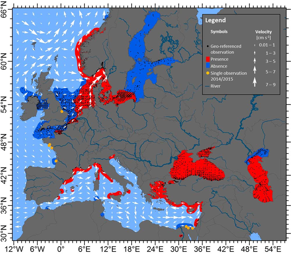 Huidige verspreiding Mnemiopsis leidyi A. Agassiz, 1865 (1519 OBIS-datapunten, 10203 GBIF-datapunten)