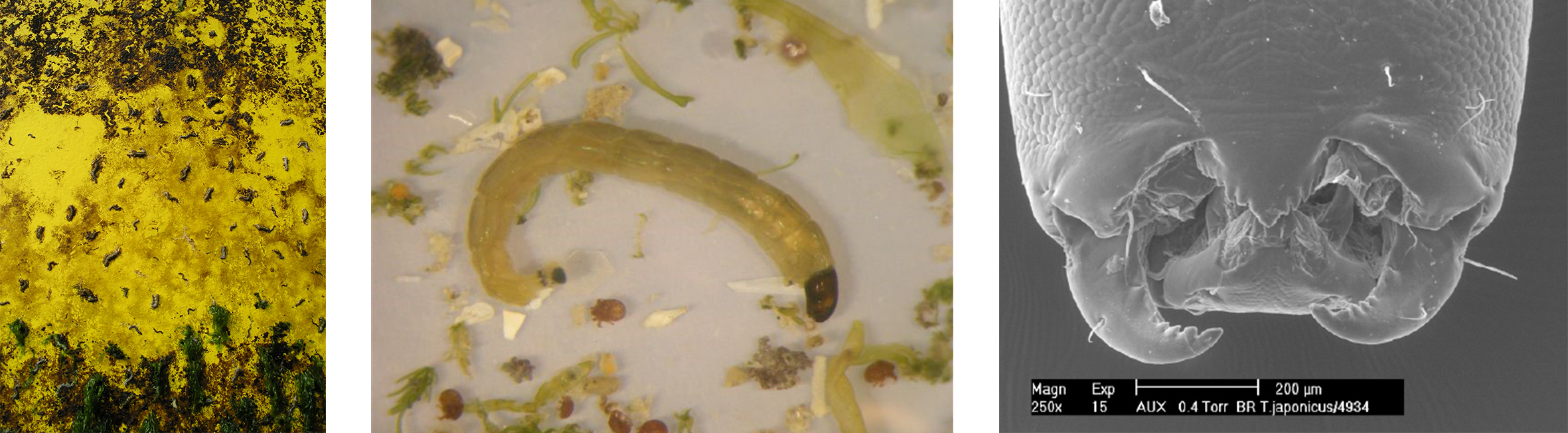 Figuur 1: (Links) Kokers met larven van Telmatogeton japonicus in de spatzone op een boei voor de Belgische kust (© Bob Rumes); (Midden) Telmatogeton japonicus larve (© Francis Kerckhof); (Rechts) Karakteritieke larvale monddelen (mentum en mandibels) van Telmatogeton japonicus (© Bob Rumes).