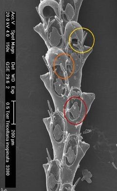 Figuur 2: Detailbeeld van een tak van een kolonie van het Onverwacht mosdiertje. De twee rijen van zoïden zijn duidelijk zichtbaar. Geel: drie buitenste stekels, waarvan de eerste meestal gevorkt is. Oranje: twee stekels op de binnenhoek Rood: verbrede stekel, gelobd als elandgewei. (© Julien Cillis)