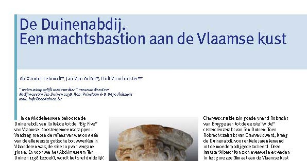 Downloaden Lehouck, A.; Van Acker, J.; Vanclooster, D. (2013). De Duinenabdij. Een machtsbastion aan de Vlaamse kust, in: De Grote Rede 37. De Grote Rede: Nieuws over onze Kust en Zee, 37: pp. 10-16 Auteurs Lehouck, A.; Van Acker, J.; Vanclooster, D.