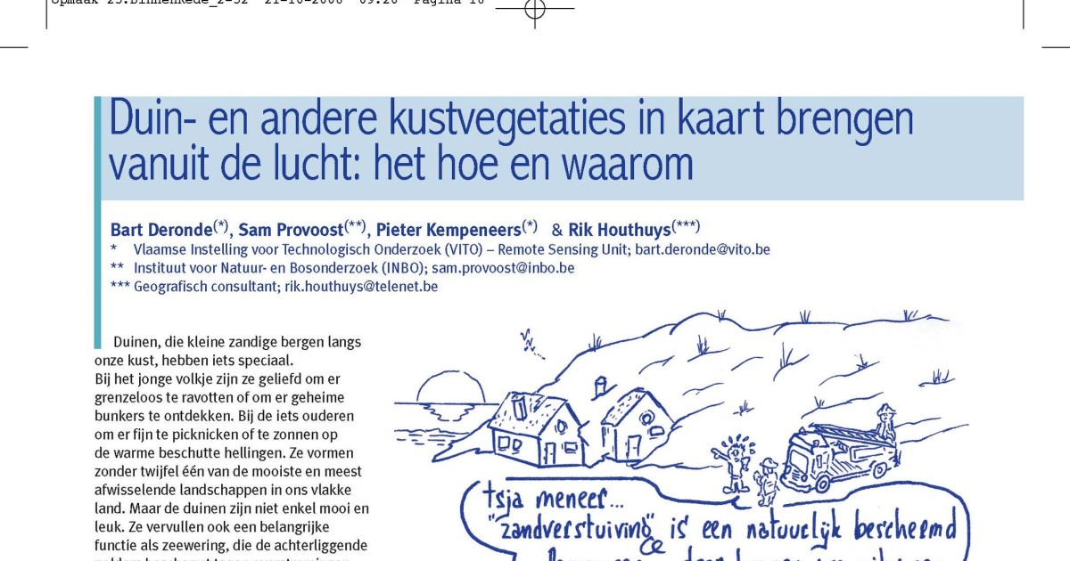Deronde, B.; Provoost, S.; Kempeneers, P.; Houthuys, R. (2008). Duin- en andere kustvegetaties in kaart brengen vanuit de lucht: het hoe en waarom, in: De Grote Rede 23. De Grote Rede: Nieuws over onze Kust en Zee, 23: pp. 16-20