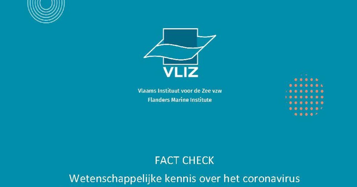 Devriese, L.I.; Pirlet, H.; Nauwynck, H.; Janssen, C.; Boon, N.; Arends, J.B.A.; Maelfait, H.; Rubbens, P.; Vandegehuchte, M.; Verleye, T.; Lescrauwaet, A.-K.; Mees, J. (2020). Fact Check. Wetenschappelijke kennis over het coronavirus SARS-CoV-2 in de context van de Vlaamse stranden. VLIZ Beleidsinformerende Nota's, 2020_003. Vlaams Instituut voor de Zee (VLIZ): Oostende. ISBN 9789492043948. 25 pp.