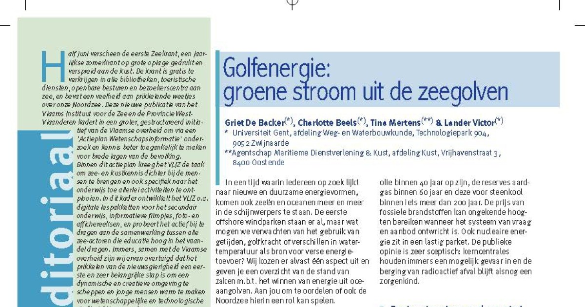 Downloaden De Backer, G.; Beels, C.; Mertens, T.; Victor, L. (2008). Golfenergie: groene stroom uit de zeegolven, in: De Grote Rede 22. De Grote Rede: Nieuws over onze Kust en Zee, 22: pp. 2-8 Auteurs De Backer, G.; Beels, C.; Mertens, T.; Victor, L.