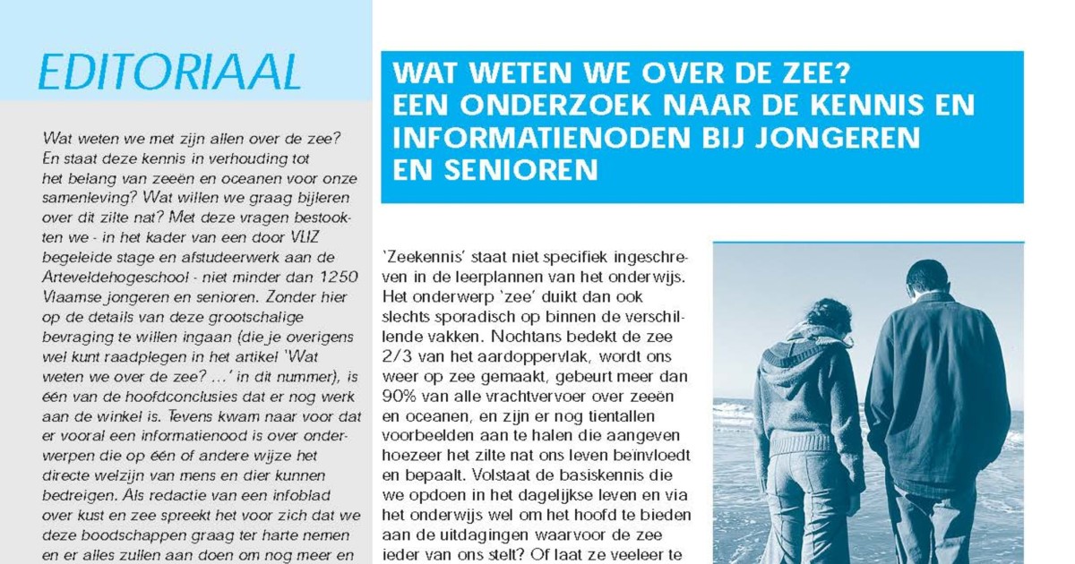 Downloaden Hoeberigs, T.; Seys, J. (2005). Wat weten we over de zee? Een onderzoek naar de kennis en informatienoden bij jongeren en senioren, in: De Grote Rede 14. De Grote Rede: Nieuws over onze Kust en Zee, 14: pp. 2-5 Auteurs Hoeberigs, T.; Seys, J.