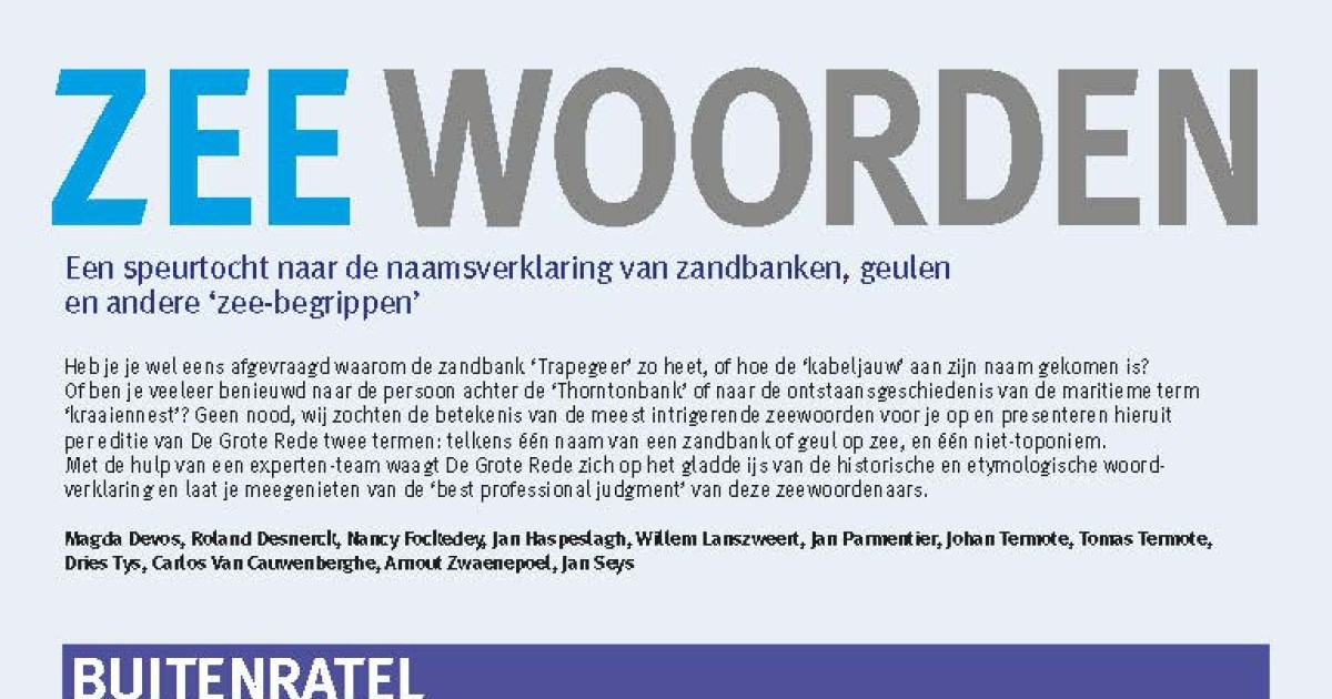 Devos, M.; Desnerck, R.; Fockedey, N.; Haspeslagh, J.; Lanszweert, W.; Parmentier, J.; Termote, J.; Termote, T.; Tys, D.; Van Cauwenberghe, C.; Zwaenepoel, A.; Seys, J. (2012). Zeewoorden: een speurtocht naar de naamsverklaring van zandbanken, geulen en andere 'zee-begrippen'. Buitenratel; Patrijspoort, in: De Grote Rede 34. De Grote Rede: Nieuws over onze Kust en Zee, 34: pp. 30-33