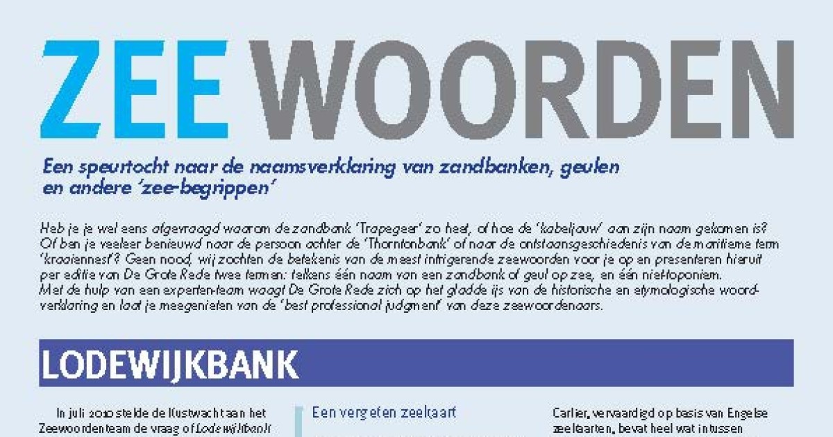 Desnerck, R.; Devos, M.; Fockedey, N.; Haspeslagh, J.; Lanszweert, W.; Seys, J.; Termote, J.; Termote, T.; Van Cauwenberghe, C.; Parmentier, J.; Zwaenepoel, A. (2010). Zeewoorden: een speurtocht naar de naamsverklaring van zandbanken, geulen en andere 'zee-begrippen'. Lodewijkbank; Kraaiennest, in: De Grote Rede 28. De Grote Rede: Nieuws over onze Kust en Zee, 28: pp. 26-29