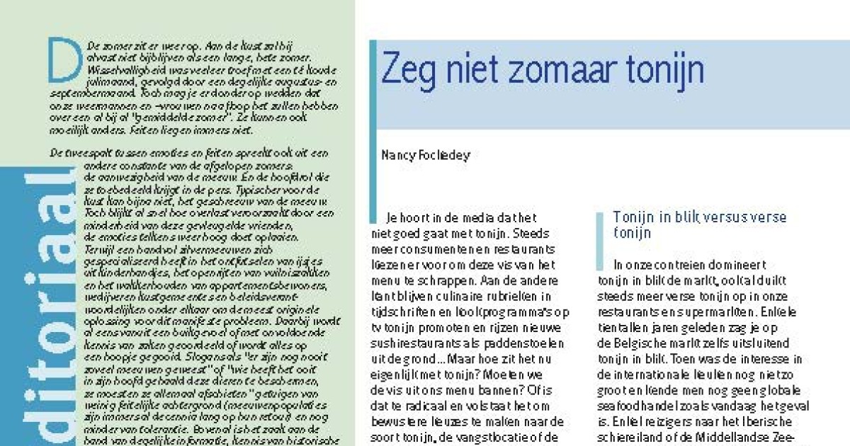 Downloaden Fockedey, N. (2012). Zeg niet zomaar tonijn, in: De Grote Rede 33. De Grote Rede: Nieuws over onze Kust en Zee, 33: pp. 2-9 Auteurs Fockedey, N.