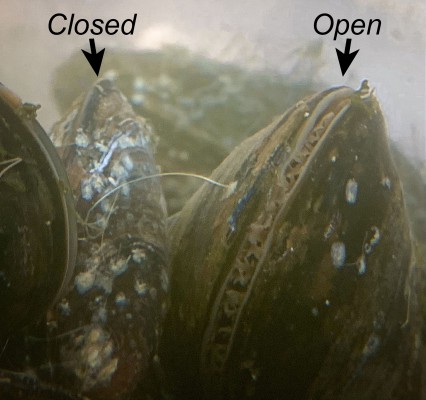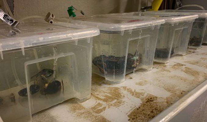 Images: Individual mussels, valve gaping behaviour and the experimental set-up before the experiment was initiated.