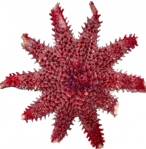 Images (1) Damage inflicted on an individual sun star by hungry green sea urchins and (2) Close-up of a green sea urchin.