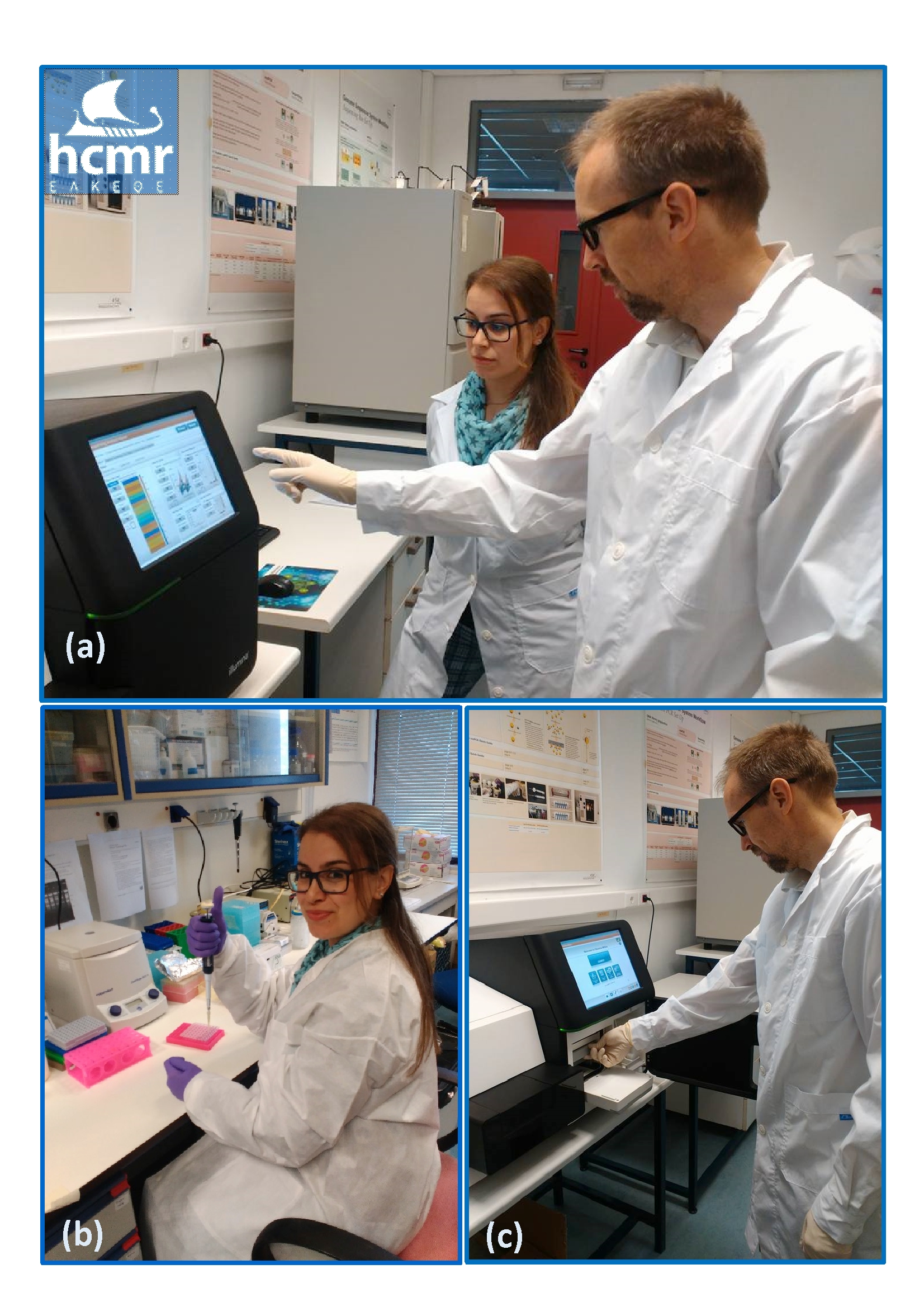(a) IMBBC MiSeq Illumina Sequencer that will be used for amplicon sequencing of OSD samples; (b) Thekla Anastasiou, Research Technician at IMBBC-HCMR doing bench work. All OSD samples are being processed by the same person for comparable results; (c) Jon Ben Kristoffersen, Researcher and NGS Technology Expert at IMBBC-HCMR. (photo credit: Paraskevi Polymenakou, IMBBC-HCMR)