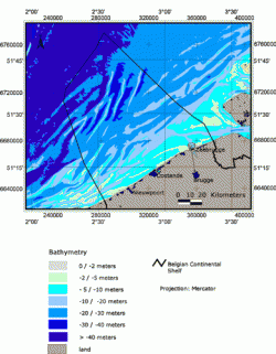 Bron: Management Unit of the North Sea Mathematical Models, Belgian Continental Shelf and bathymetry, Royal Belgian Institute of Natural Science MUMM: http://www.mumm.ac.be/EN/NorthSea/geography.php .