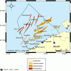 Bron: Management Unit of the North Sea Mathematical Models, Zandbanken, Belgian Institute of Natural Science [WWW], MUMM: http://www.mumm.ac.be/NL/Management/Atlas/map.php?Sandbanks.