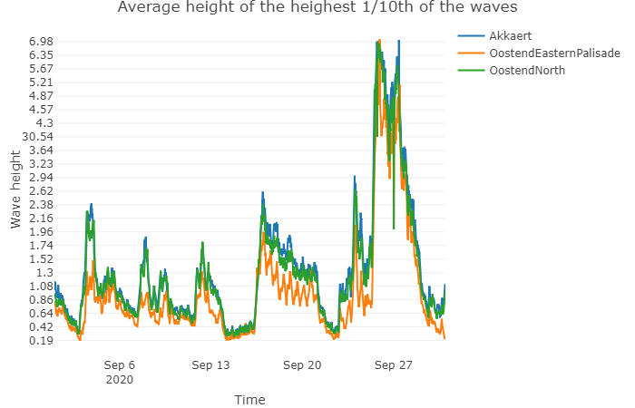 Wave height is periodically recorded by several stations in the BPNS and values are stored in the publicly available EMODnet database. Wave heights are subsetted in different measurement units and parameters, namely: significant wave height, height of highest 1/10 waves and zero crossing wave period. Additionally, maximum, minimum and average values are given for each parameter and displayed in interactive plots. Wave data is linked below for four stations.