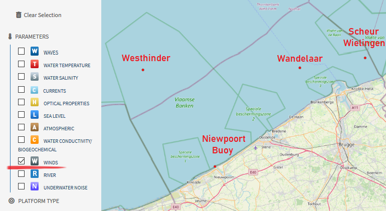 There are four stations recording wind data in the BPNS: Westhinder, Nieuwpoort Buoy, Wandelaar and Scheur Wielingen. In order to access wind information from these stations select the filter 'parameters -> Wind' within the EMODnet interface. Station specific data can be retrieved by clicking any station on the map or drawing a polygon surrounding multiple stations.