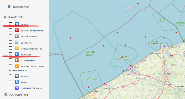EMODnet counts with a large number of stations within the BPNS making continuous recordings of sea state parameters, mainly wave height statistics. Sea level is an additional sea state variable measured at these stations. Data of these parameters can be accessed selecting the filter parameters -> Waves and Sea level within the EMODnet interface. Station specific data can be retrieved by clicking any station on the map or drawing a polygon surrounding multiple stations.