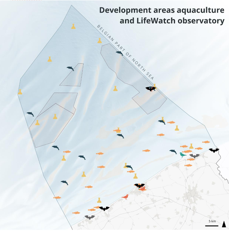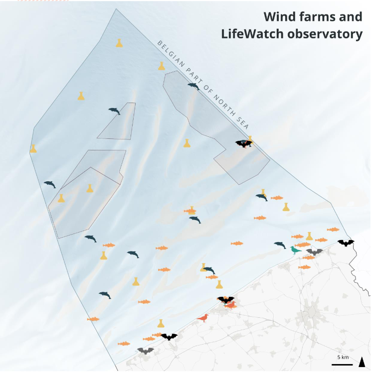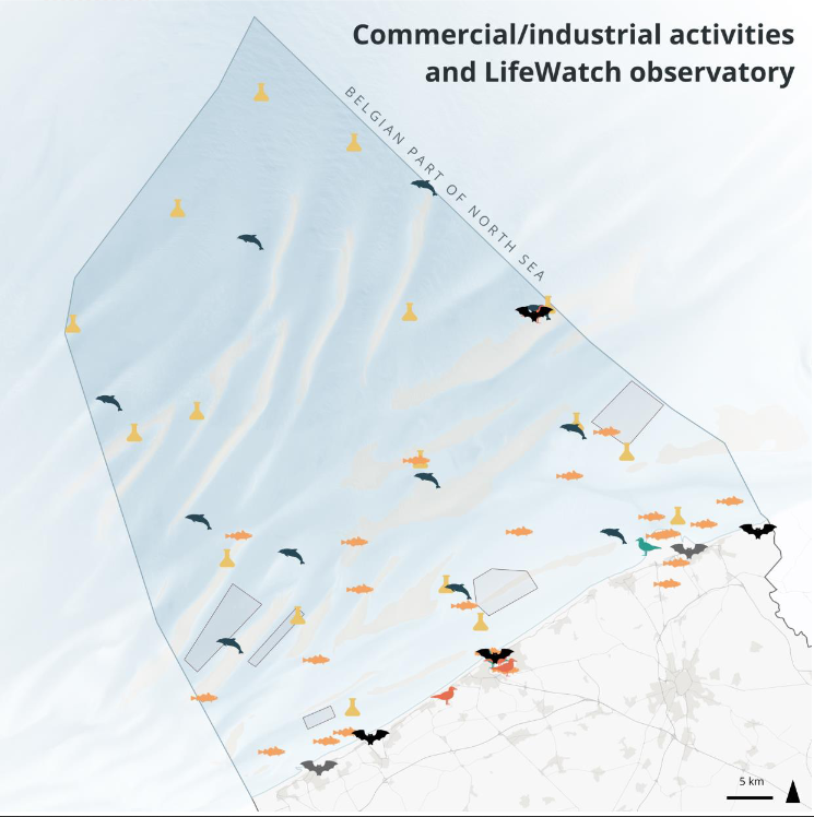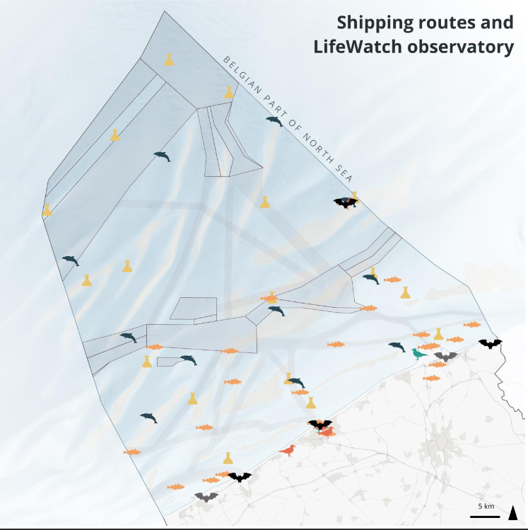 LifeWatch has an extended observatory network with multiple stations spread over the Belgian Part of the North Sea. This observatory network includes a fish acoustic receiver network and several stations measuring environmental variables in the water column on a monthly and seasonal basis, among other things. All the collected data is made available through the LifeWatch data explorer portals. This page presents a number of maps that give an overview of the LifeWatch stations and their positioning with regards to industrial & commercial activities such as wind farms, shipping routes, aquaculture etc.