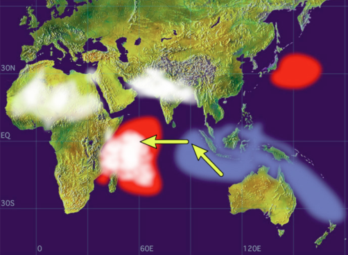 Ocean-climate interactions - The Western Indian Ocean interacts with regional and global climate systems on three scales – seasonal, interannual to decadal and over the long term. The monsoon seasonality of the Indian Ocean is perhaps one of the strongest ocean-climate interactions on the planet. Driven by the summer-winter oscillation of solar heating over Asia, it results in oscillating trade winds and associated shifts in currents in the Indian Ocean. During the southern winter, when the sun is over Asia and North Africa, the resulting low pressure system sucks in air masses from the south resulting in southeasterly winds, associated with cooler temperatures and generally rough conditions in the Indian Ocean. During the southern summer, northeasterly winds are established drawing hotter dry air from Asia and the Sahara southwards. In between these seasons, calmer inter-monsoon doldrum conditions prevail. The alternating winds cause current reversals in the northern part of the Indian Ocean, where the Somali Current and northern Indian Ocean gyre oscillate between the seasons. The monsoon does not reverse currents in the south, but it does strongly modulate their speed and variability. Variability among years is due to the Indian Ocean’s equivalent of the Pacific Ocean’s El Niño Southern Oscillation (ENSO), known as the Indian Ocean Dipole (IOD). As with the ENSO, the IOD reflects differences in sea surface temperature, and therefore rainfall and winds, between the eastern and western parts of the ocean, moderating seasonal conditions across the ocean. These patterns of variability are further influenced by other oceanographic features of the WIO, including a Seychelles-Chagos ‘ridge’ in the thermocline that affects sea surface temperatures and thereby ocean-atmosphere interactions, and decadal features similar to the Pacific Decadal Oscillation (PDO). With relevance to long term global climate trends, leakage of Agulhas Current rings into the south Atlantic may be among the main controlling factors affecting climate dynamics historically, and perhaps under a changing climate, due to their role in the ocean circulation conveyor belt. Paleo-oceanographic history - Little is known about the oceanographic history that influences the WIO, but emerging research is highlighting some key features that may have contributed to today’s unique features in the WIO. Until the closure of the Tethys Sea (30-15 mya), it is likely that ocean currents linked the Tethys and the WIO. Equatorial currents crossing the Indian Ocean from east to west were first blocked by India as it migrated northwards (65-40 mya), and then likely by the string of islands and banks produced by the Mascarene-Reunion hotspot (45-20 mya) that now form the Mascarene Plateau. Further, before the Miocene, there was very little development of the shallow marine communities that are dominant today (e.g. coral reefs) in what is now southeast Asia. These communities only began to form at the start of the Miocene, 24 mya, when the Australian and Asian plates collided and formed the Indonesian island arc. As a result, up to 24 mya it appears that shallow marine habitats in the WIO had a primary connection with the Tethys Sea as it closed, and only subsequent to that, a primary connection with the emerging center of diversity in the Southeast Asian region.