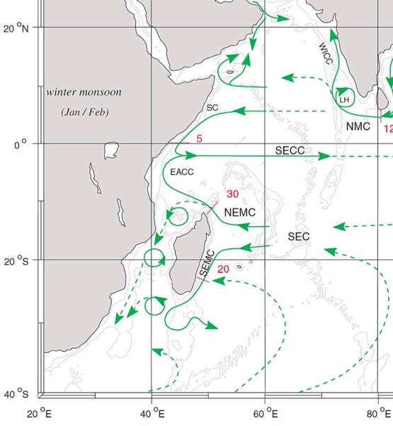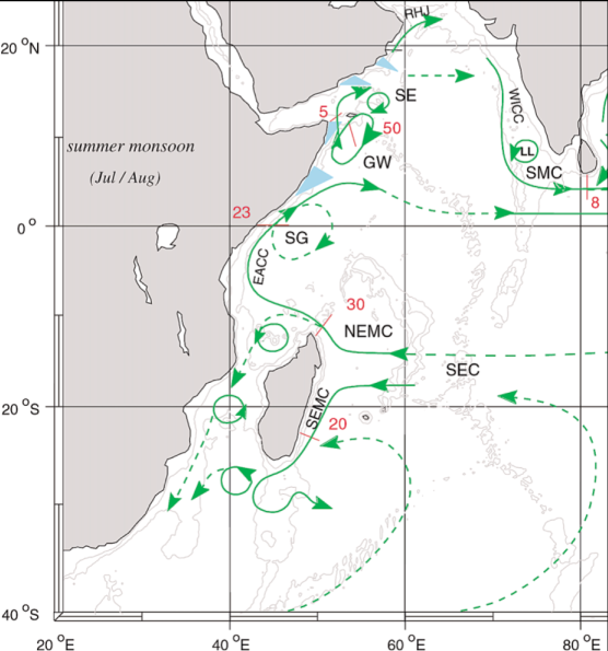 OceanographyThe oceanography of the Western Indian Ocean is dominated by three features arising from its geology and tectonic history – the Asian landmass in the north, the island of Madagascar, and the Mascarene Plateau – and their interactions with the equatorial and western boundary currents of the Ocean basin. The Asian landmass drives the seasonal monsoon system that dominates the climate of this region of the globe, while Madagascar and the Mascarene Plateau interact with the currents imparting meso-scale (features on a scale of about 100-500 km) dynamics that are unique to the ocean. The dominant features of the oceanographic processes in the WIO are: