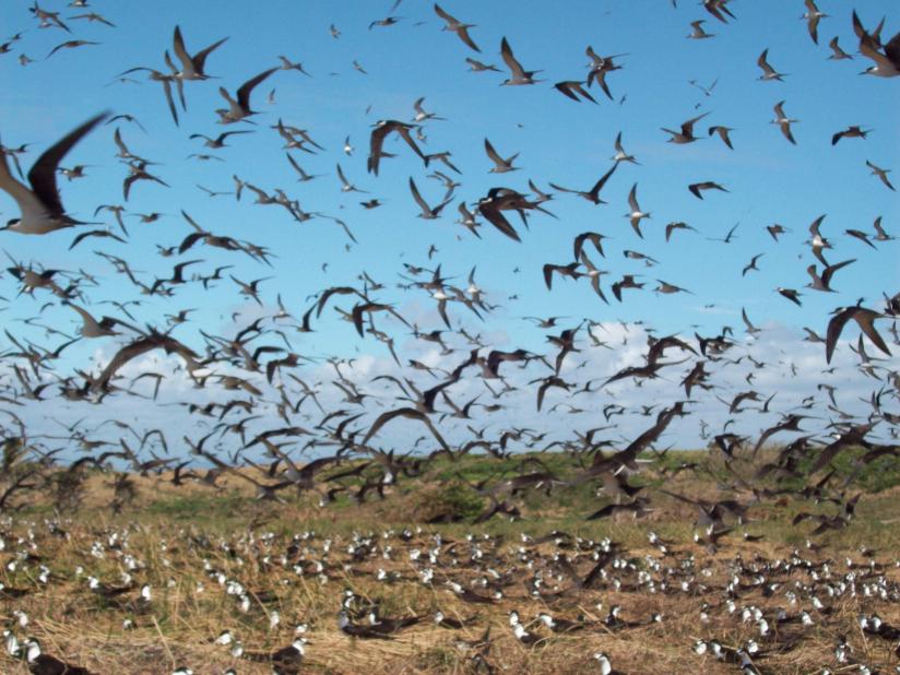 SeabirdsSeabirds, i.e. species that spend a large part of their lives at sea, of the coast of mainland East Africa, associated islands and of the open sea are abundant and diverse, though they have received little attention in the region until the last 5-10 years. Recently, growing interest in how they can serve as indicators to patterns of oceanic productivity, and thereby to fisheries, has led to a rapid upsurge in studies. Further, the impacts of growing, ocean-wide fishing effort have led to greater concern about impacts, to the marine environment as well as to seabirds. Breeding and nesting - A recent regional survey of the seabird species that breed in the WIO estimated a total seabird population of 7.4 million pairs, and found that the main breeding grounds are in the Seychelles (Aldabra and the granitic islands) and in the Mozambique Channel (Juan de Nova, Europa and Glorieuses). The Mascarene Islands also have significant breeding populations, at smaller numbers but for rarer species. In 2005, 16 species were recorded breeding in the Mozambique channel with an extraordinarily high density of over 3 million breeding pairs, of which 99% were sooty terns (Sterna fuscata), concentrated at Juan de Nova (66%, 2 million pairs), Europa (25%, 760,000 pairs) and Glorieuses (9%, 270,000 pairs). Thirteen thousand pairs spread among 13 seabird species breed on islets off the W coast of Madagascar, but population sizes are low and threatened by poaching. Europa is of particular conservation interest as it holds some of the last colonies of large Pelecaniforme birds (frigatebirds, red-footed boobies and red-tailed tropicbirds), which have experienced dramatic declines in most islands of the WIO.