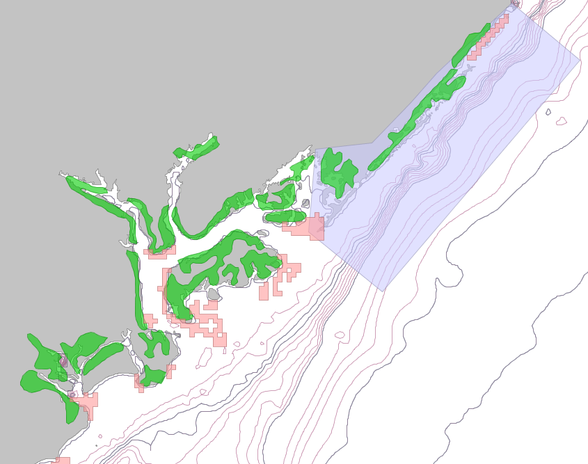 Map showing the Kiunga (blue polygon) and Pate/Manga/Magogoni of the Lamu-Kiunga archipelago. The extent of mangrove (green) and coral reef (pale orange) is shown.