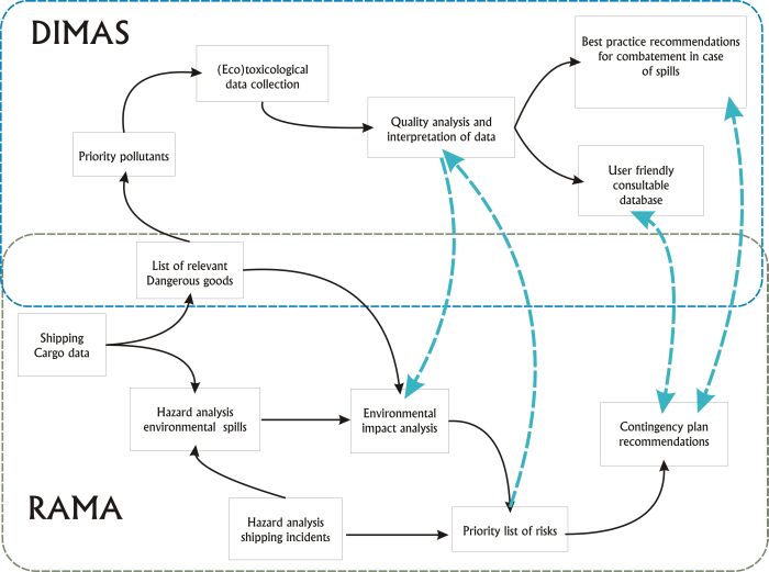 For the background of the MIMAC cluster, reference is made to the two integrated projects: RAMA (Risk analysis of marine activities in the Belgian part of the North Sea). DIMAS (Development of an integrated database for the management of accidental spills). The interactions between the 2 projects are shown in the underlying scheme: