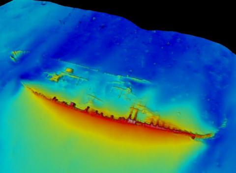 Figuur: multibeam beeld van een wrak voor de kust van Oostende (mei 2015)